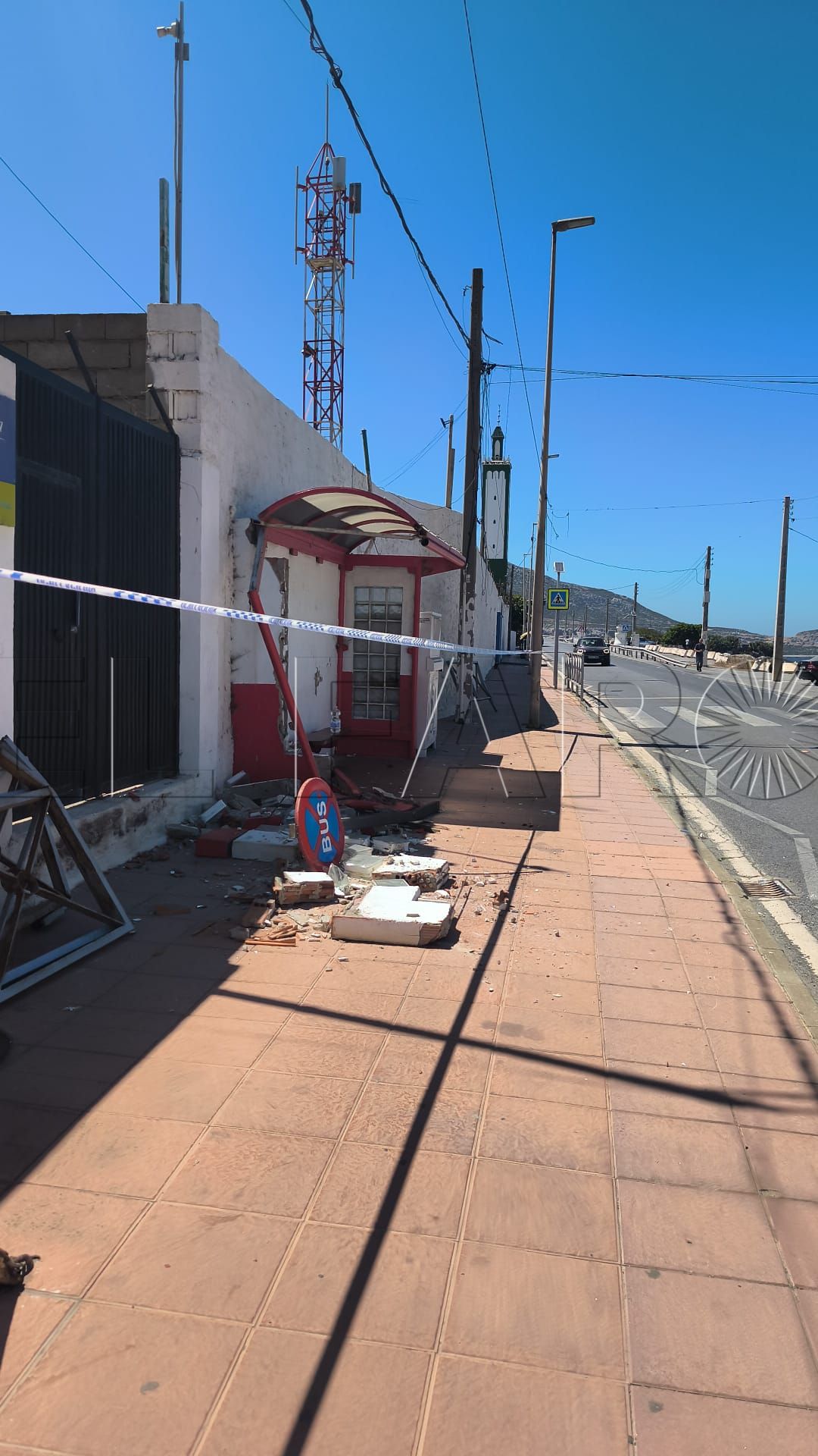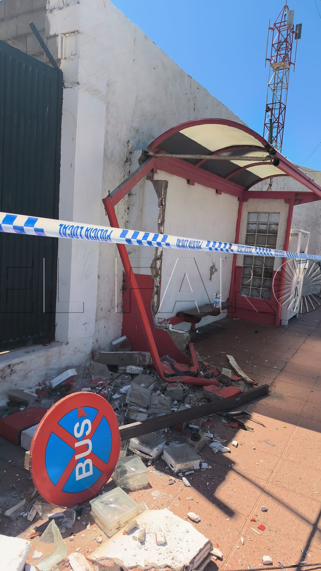 En el caso de la marquesina de bus de Benzú, tal y como se aprecia en las imágenes facilitadas a este periódico, se encuentra totalmente destrozada. Junto a los bloques procedentes de la estructura totalmente rota, asoma la propia señal que advierte de la parada de bus que quedó tendida en el suelo.