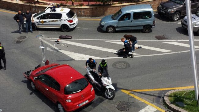 Una persona resultó policontusionada en la tarde de ayer después de producirse un accidente entre un coche y una moto en la rotonda del Poblado Marinero que enlaza con el desdoblamiento del Paseo de las Palmeras.
