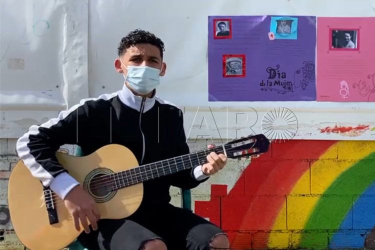 “Un pasito más, que sí se puede. Uno y otro más, mujer valiente. Lo que diga está de más, ya sé que quieres gritar. Y no te sientas sola, contigo estoy…”. La mujer de las mil batallas, de Manuel Carrasco, suena en boca de Adam Chefraro. Este joven marroquí de 17 años aprende español a base de escuchar canciones, de aprenderlas y de cantarlas después, acompañado de su guitarra. En el albergue de Piniers que gestiona Cruz Roja-Ceuta supieron captar esa inquietud y no solo le regalaron una sino que le han apoyado en todo para que perfeccione ese talento musical que traía consigo y con el que cruzó la frontera.