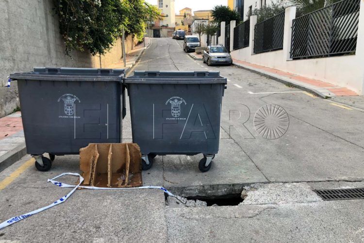 Ante la falta de más medios, la Policía Local se ha visto obligada a tener que usar dos contenedores de basura a modo de advertencia para que nadie pase por encima del agujero, además de poner la cinta que indica la prohibición de paso a falta de una valla adecuada para esta función.