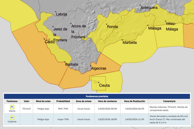 La Agencia Estatal de Meteorología (AEMET) ha ampliado la alerta amarilla, concretamente por vientos y fenómenos costeros, ante una secuencia de inestabilidad meteorológica que afectará especialmente durante las próximas horas a propósito de la borrasca Oriana. Así lo ha dado a conocer la Ciudad la noche este viernes a través de un comunicado.