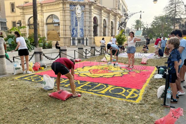 Como cada año, operarios de la Ciudad, en colaboración con los miembros de las hermandades y cofradías de Ceuta, han dibujado una alfombra ornamental a base de helechos y 9.875 kilos de arena de sílice de distintos colores.