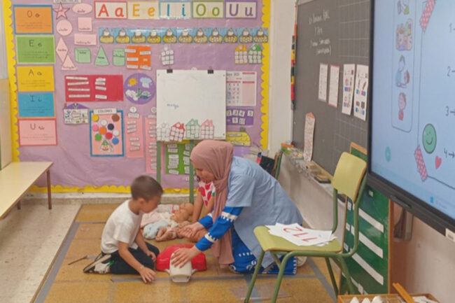 Desde el Colegio Oficial de Enfermería de Ceuta contaron que ambas profesionales aprovecharon este taller “para enseñarle a los más pequeños a realizar las maniobras de RCP, pudiendo practicarlas bajo las indicaciones de las enfermeras con muñecos que los alumnos habían traído de casa”.