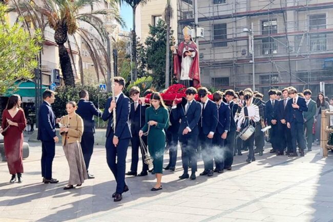 La imagen de San Agustín, portada a hombros por varios jóvenes del centro, apareció entre el característico olor a incienso, que impregnó el ambiente desde el primer momento. Tras la talla desfilaba la banda de música, seguida por grupos de alumnos que avanzaban con entusiasmo y una gran sonrisa, reflejo del orgullo por participar en una tradición tan significativa para el colegio.