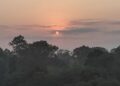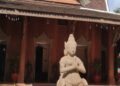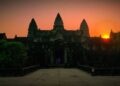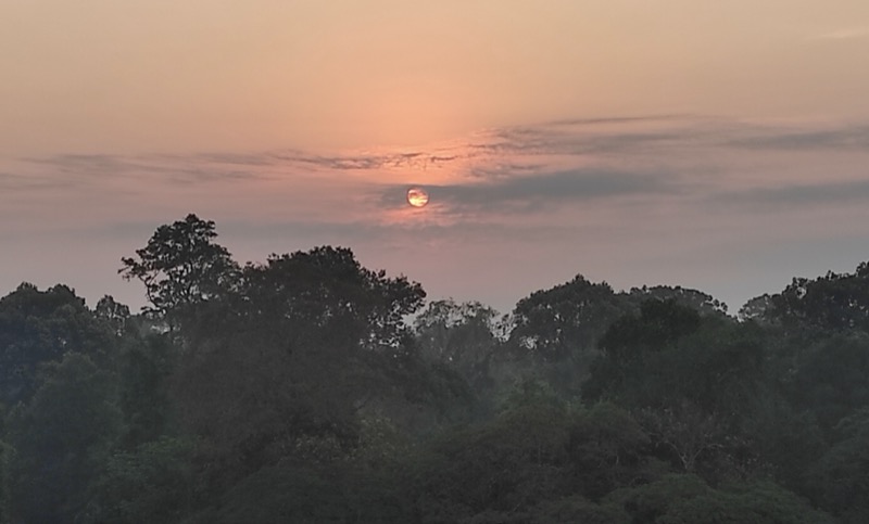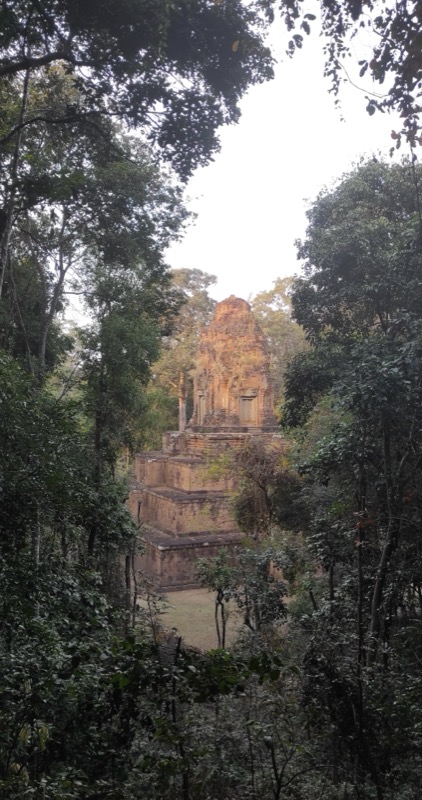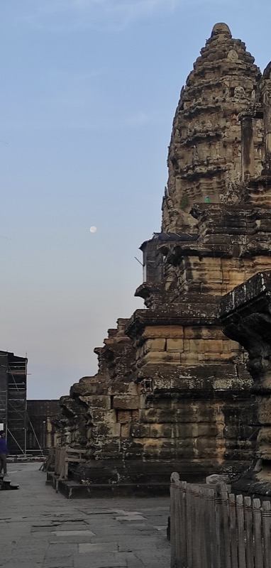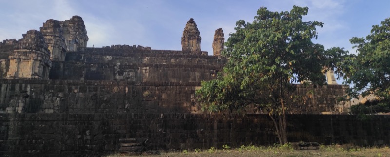 Todas las noches en Siem Riep son una fiesta, todo el mundo sale a la calle a celebrar, sea cual sea la razón. Los farolillos de colores y las guirnaldas adornan e iluminan las calles. Al contrario que por la noche, durante el día apenas hay vida por las calles, supongo que el bochornoso calor es la razón. Aun así yo salgo a ver los alrededores de Angkor Wat. El canto de las cigarras me acompaña por todo el camino, ésta vez provisto de agua, bordeo durante un par de kilómetros hacia el oeste de las ruinas para sorprenderme con las vistas de Angkor Wat al atardecer. Mi orientación estaba en modo siesta, me perdí, anduve entre los altos arboles y en un apartado del camino, entre el frondoso follaje vi una pirámide de cuatro plantas con una estructura en lo alto de color rojiza, sin duda un lugar de culto. Decidí subir hasta lo alto de la colina para ver atardecer. Silencio.