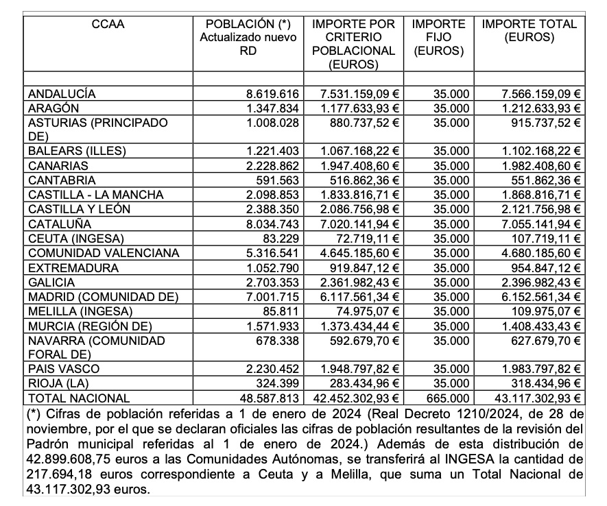 La distribución se estructura en una cantidad fija igual para cada comunidad autónoma e Ingesa (35.000 euros a Ceuta) y una cantidad variable asignada conforme al criterio poblacional (72.719,11 euros para la ciudad autónoma), con base en el censo oficial del Instituto Nacional de Estadística de 2024. Asimismo, se tiene en cuenta el grado de ejecución de los fondos asignados en el ejercicio anterior y la memoria de actuaciones presentadas.
