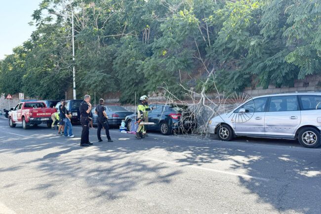 Dos de los coches se han visto afectados con daños causados por las ramas. Bomberos ha acudido al lugar para la retirada de dicho árbol, mientras que la Policía controlaba ese espacio para permitir el trabajo adecuado de los integrantes del SEIS y reordenar el tráfico rodado.