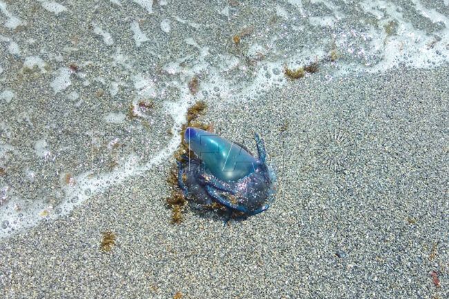 La carabela portuguesa, con su llamativo flotador gelatinoso que actúa como vela para desplazarse a merced del viento y las corrientes, es un visitante de las costas ceutíes y del resto del Mediterráneo occidental, especialmente durante los meses de primavera y verano.