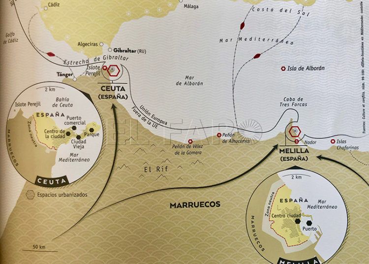 Dedica un apartado concreto a los “enclaves españoles”, a los que expresamente denomina “Europa en África”. El Mapa 2 reproduce el que a toda página contiene el libro. En él se incluyen dos epígrafes que se convierten en titulares para definir la situación: “Dos puertas europeas en África…” y “… foco de atracción para los inmigrantes”. En la parte descriptiva señala que “el incremento de la inmigración ilegal, procedente principalmente del África subsahariana, ha llevado a la construcción de unas “vallas” cada vez más difíciles de cruzar”.