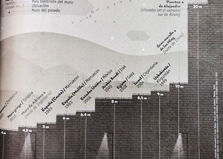 El Atlas confirma que los muros, en la actualidad, solo representan una minoría de las fronteras trazadas. “Dependiendo de las definiciones y de los métodos de cálculo, -expone- entre el 3% (7.500 Km.) y el 18% (41.000 Km.) de las fronteras terrestres”. Realmente una pequeña parte, pero significativa. Destaca ejemplos anteriores, como la Gran Muralla china, el muro de Adriano y el muro de Berlín. Aunque este último es un caso muy particular, porque es uno de los únicos muros conocidos –junto al telón de acero en su conjunto y la actual frontera de Corea del Norte- concebido para impedir la salida y no para reprimir la entrada.