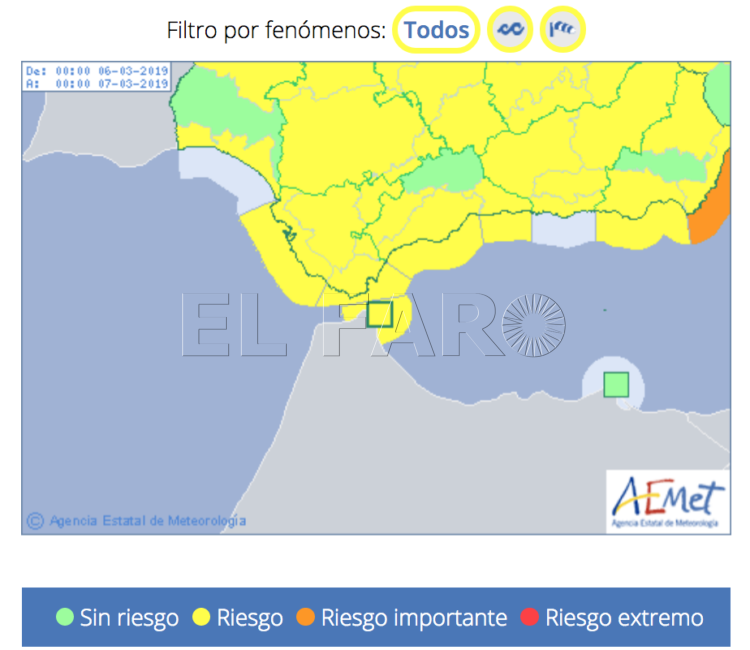 La Agencia Estatal de Meteorología (AEMET) ha establecido aviso amarillo por vientos y fenómenos costeros para todo el área del Estrecho para mañana miércoles. Según las previsiones, el viento soplará fuerte, pero de poniente, por lo que no se teme en principio por el cierre de la línea marítima.