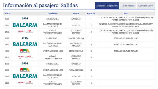 No obstante, al consultar la página de información al pasajero, aunque se refleja la salida d de los barcos, también se informa sobre retrasos en las rotaciones.