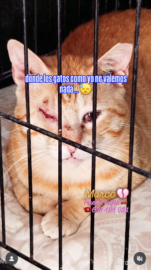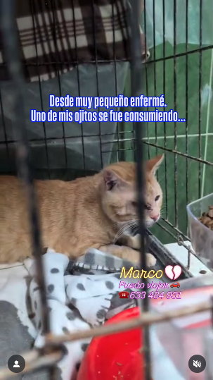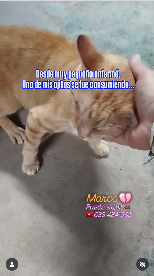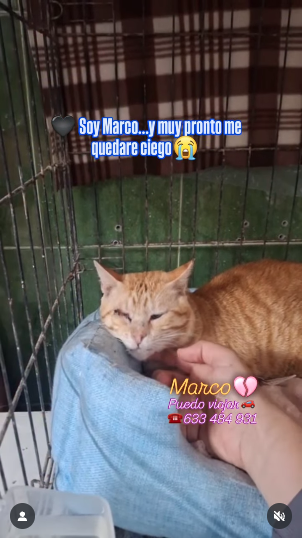 Marco, un gato joven rescatado de la barriada El Príncipe de Ceuta, se encuentra en una situación crítica. A punto de perder por completo la vista, necesita con urgencia ser trasladado a la península para recibir tratamiento veterinario especializado. De lo contrario, su futuro está marcado por la ceguera y el abandono.