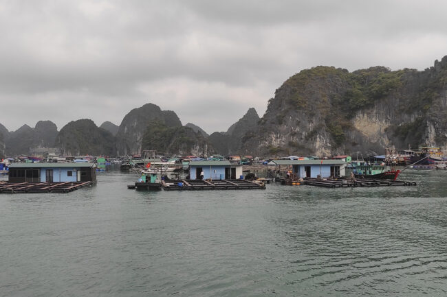 En el hostel donde me hospedaba compré un billete para pasar el día entero navegando en un barco por la bahía de Ha Long. A la mañana siguiente, temprano, salimos desde el embarcadero rumbo a las montañas emergentes de las aguas de la bahía de Ha Long. Visitamos las casas sobre pilotes de los pescadores de la bahía, se mostraron muy amables con nosotros. Fuimos a una piscifactoría donde había unos peces enormes que de vez en cuando emergían por sorpresa, haciéndose hueco entre el resto de peces. Hicimos kayak alrededor de unas de las montañas que emergían del agua como si fueran el lomo de un dragón marino. La comida a bordo a base de pescado y verduras estaba exquisita. En fin, fue una grata experiencia que, sinceramente, no esperaba. No estoy a favor de contratar tours para conocer las ciudades o lugares a visitar, prefiero ir por libre pero en la bahía de Ha Long solo hay dos formas de conocerla: mediante un tour o alquilando una barca por tu cuenta y mi presupuesto no daba para tanto.