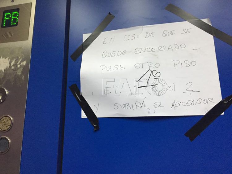 “En caso de que se quede encerrado, pulse otro piso y subirá el ascensor”. Así, en una cuartilla de folio, pegado con cinta aislante dentro del ascensor, figura el mensaje dirigido a los usuarios del edificio Ceuta Center, a todos aquellos que quieran subir a las salas judiciales (juzgados de lo Penal y Audiencia) y a los servicios municipales que hay en este punto. Es decir, que si usted se queda atrapado, tendrá que optar a una oportunidad chapucera para poder librarse de este aprieto.