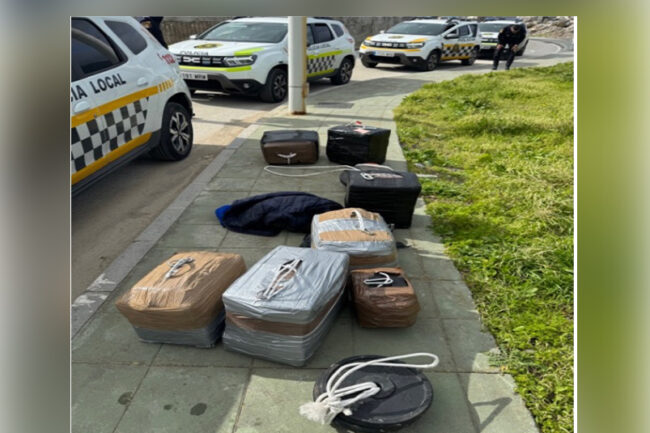 Durante la inspección del entorno, los agentes localizaron ocho bultos de grandes dimensiones ocultos bajo una persiana, que desprendían un fuerte olor a hachís, así como pesas de aproximadamente 20 kilogramos, sujetas con cuerdas y mosquetones, presuntamente utilizadas para el anclaje de la sustancia estupefaciente.