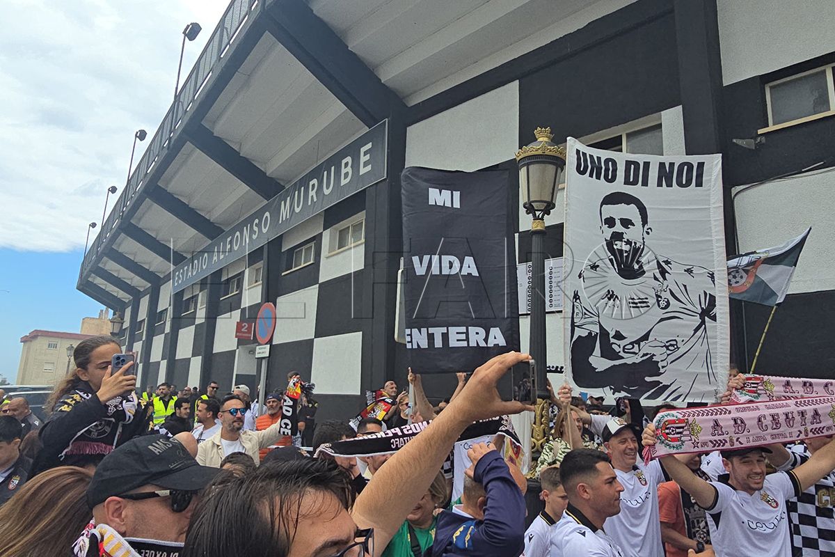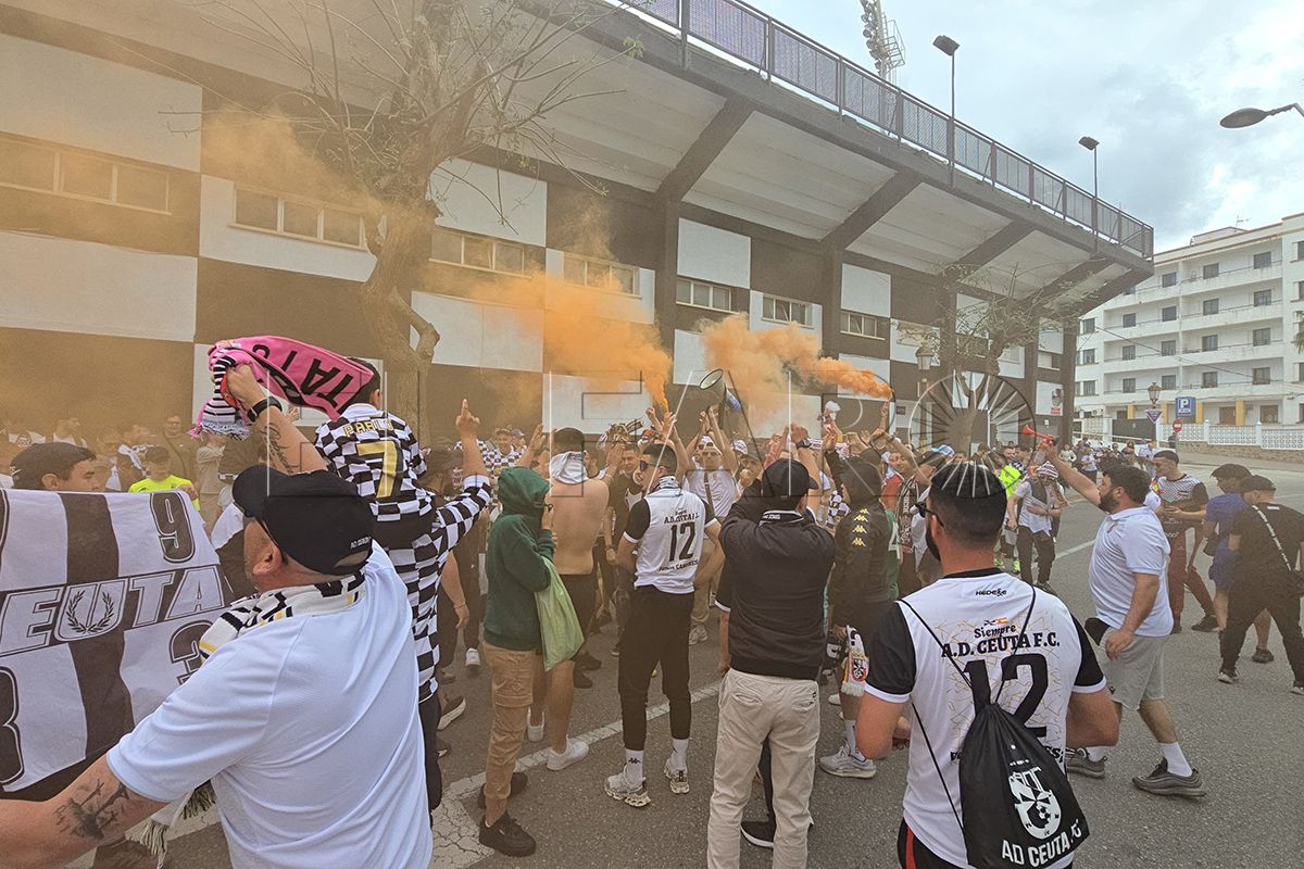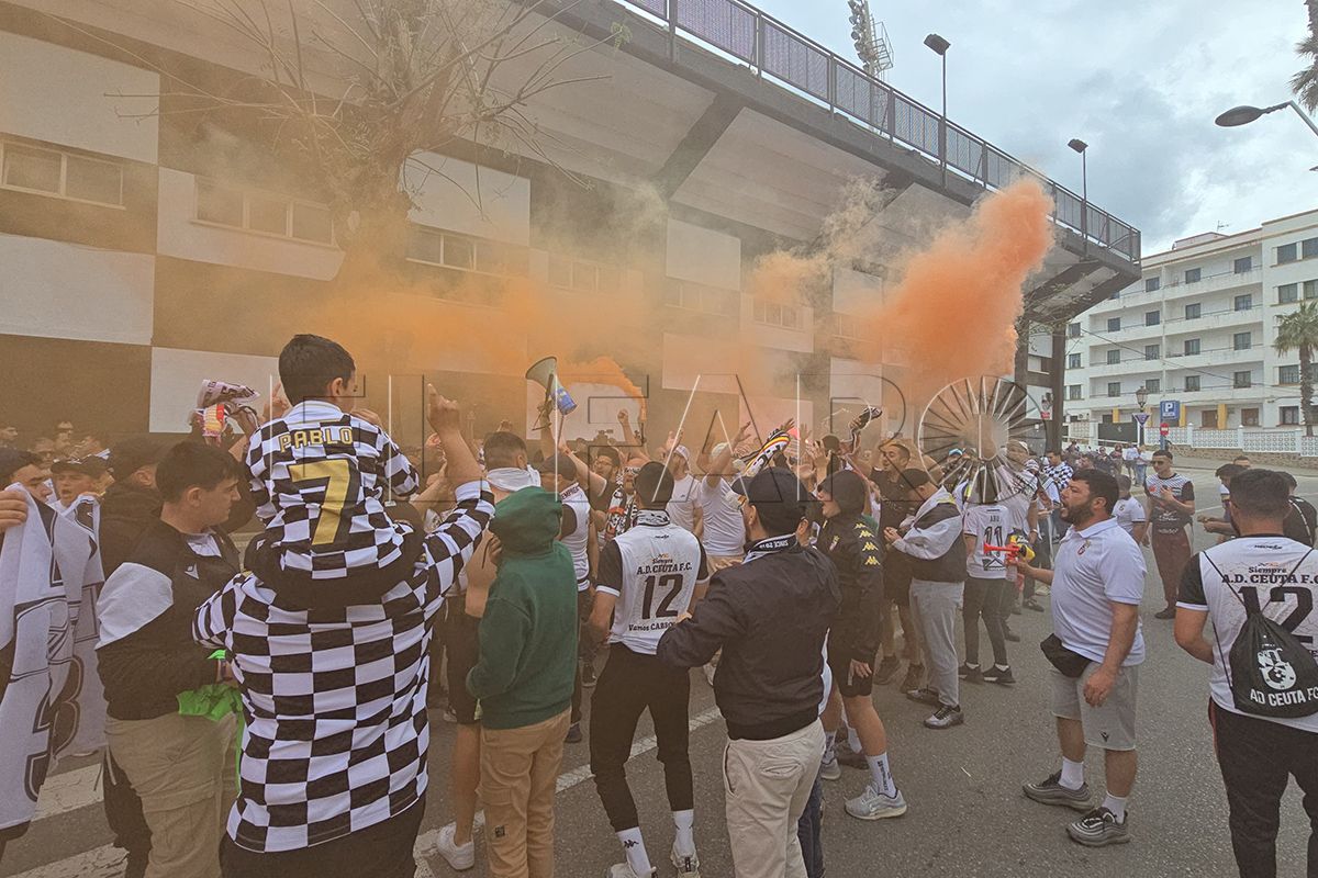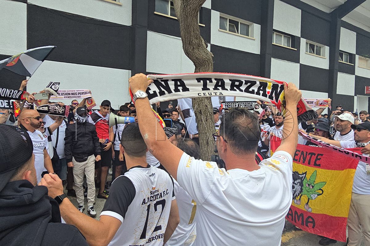 Los hinchas se agolparon en la puerta de vestuarios del feudo caballa para esperar a los jugadores del primer equipo que enfilaban el acceso para entrar al campo. Los seguidores del Ceuta gritaron sin parar y arroparon a los suyos en un partido trascendental para seguir siendo líderes y más que nunca, soñar con la Segunda División.