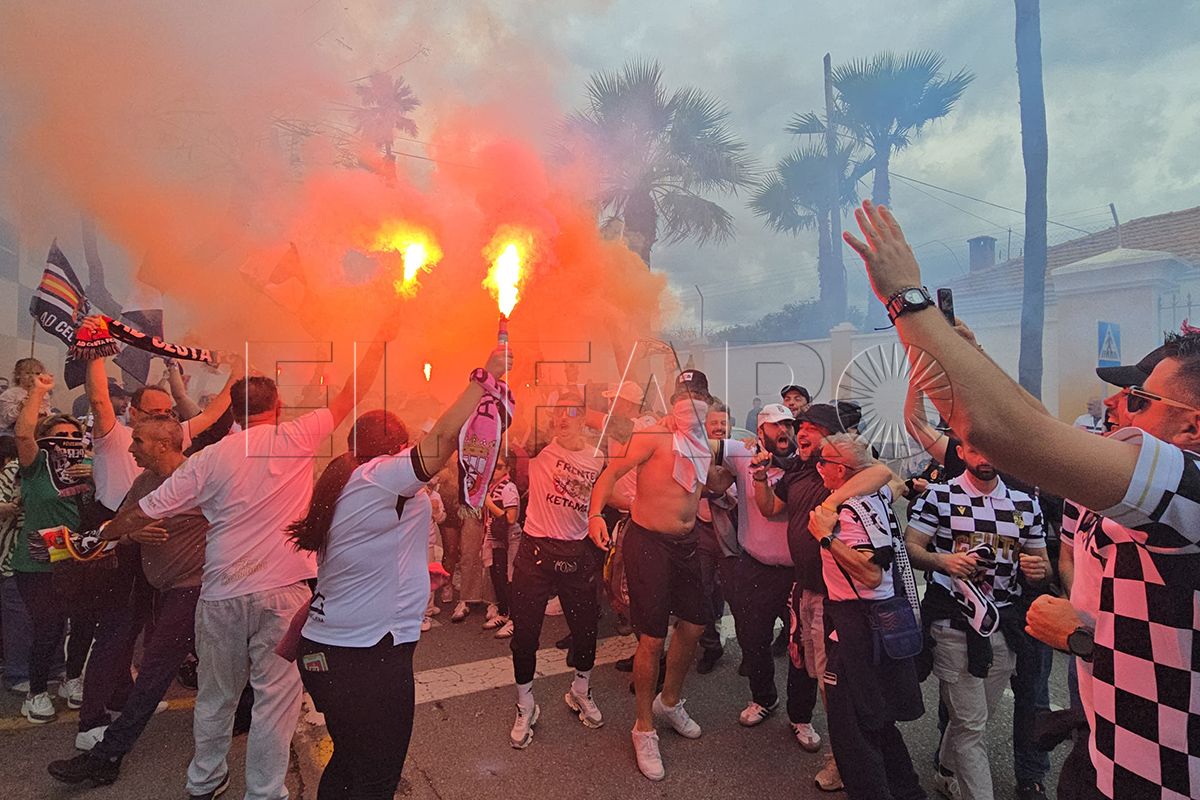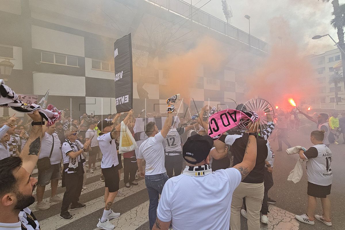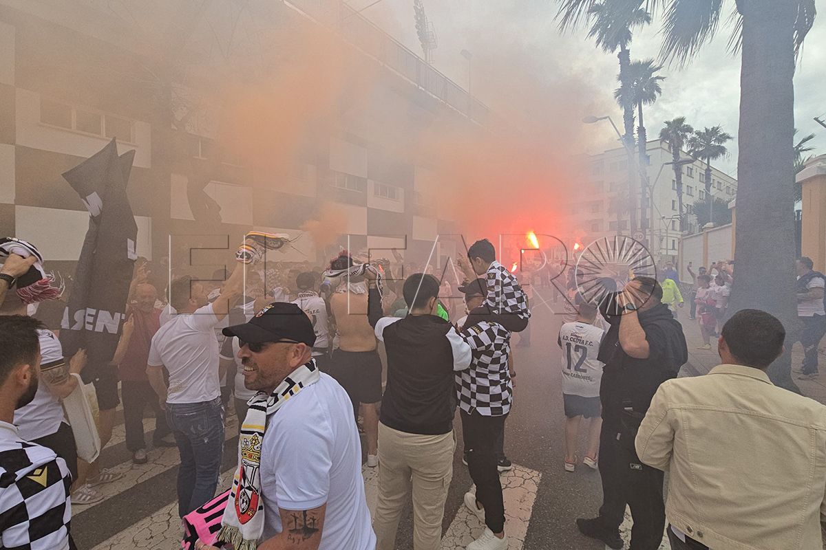 El equipo de José Juan Romero está rozando la Segunda División, sus hinchas lo saben más que nunca y por eso se han volcado este sábado de lleno desde las 12 de la mañana con una caravana desde La Marina y sobre las dos de la tarde acudieron a los aledaños del ‘Alfonso Murube’ para recibir al equipo.