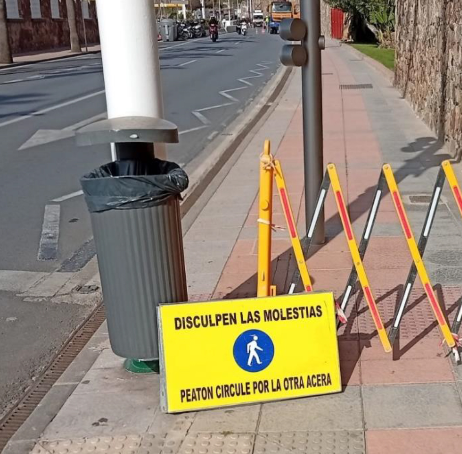 El primer cartel corresponde a un aviso de corte de paso por la acera, porque más adelante un camión se encuentra asistiendo la obra en las murallas reales, hasta ahí todo correcto; lo que no es tan correcto es colocar el aviso a metro y medio del semáforo de pulsación, por lo que el peatón no sabe muy bien que hacer: si sortear el cartel para ir hasta el semáforo a pulsarlo o arriesgarse y cruzar cuando bien pueda. Con lo fácil que es colocar valla y cartel detrás del semáforo. Y esto no ocurre de vez en cuando -los arreglos en las murallas llevan meses- más bien cada vez que el camión está por allí… y no será porque no se les ha indicado, por lo menos yo.