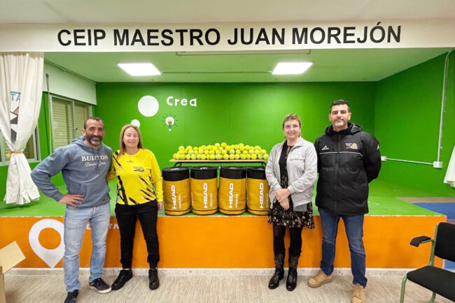 El acto se ha llevado a cabo en las instalaciones del centro educativo, donde María Carmen María García, directora del ‘Maestro Juan Morejón’, acompañada de uno de sus compañeros del equipo directivo, Claudio Tinoco, del presidente de la Federación de Tenis de Ceuta, Yasin Harrús, y de la responsable técnica de las escuelas de Tenis de la FTC, Isabel Jiménez Suárez, han realizado el acto de entrega de 400 pelotas de tenis.