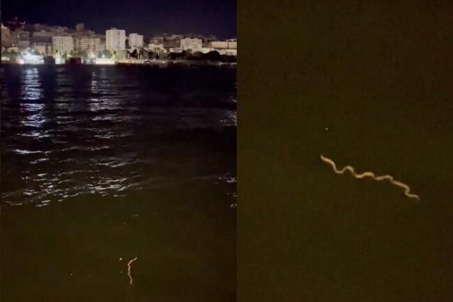 Era de noche y lo que divisaba se parecía a réptil que serpenteaba rozando la superficie. “No es común verla por aquí o al menos en el agua”, manifestó con asombro el testigo que no dudó en grabar un vídeo para mostrárselo a sus conocidos a la espera de que alguien le aclarará con qué animal había sido este encuentro.