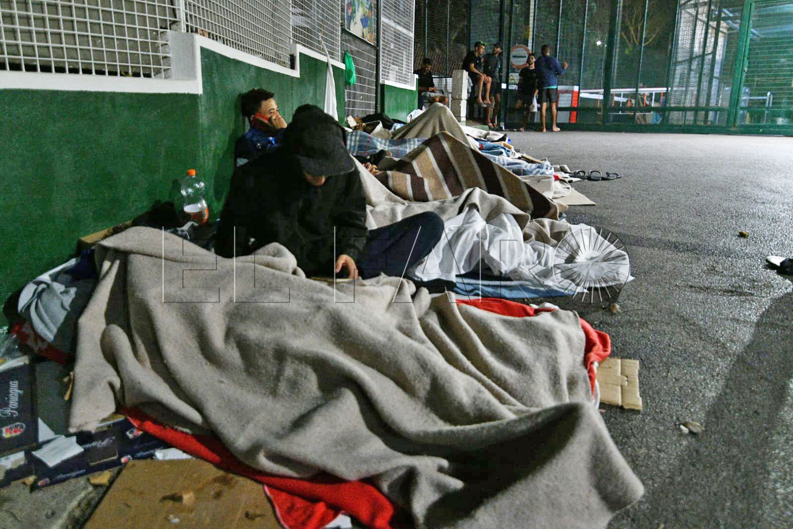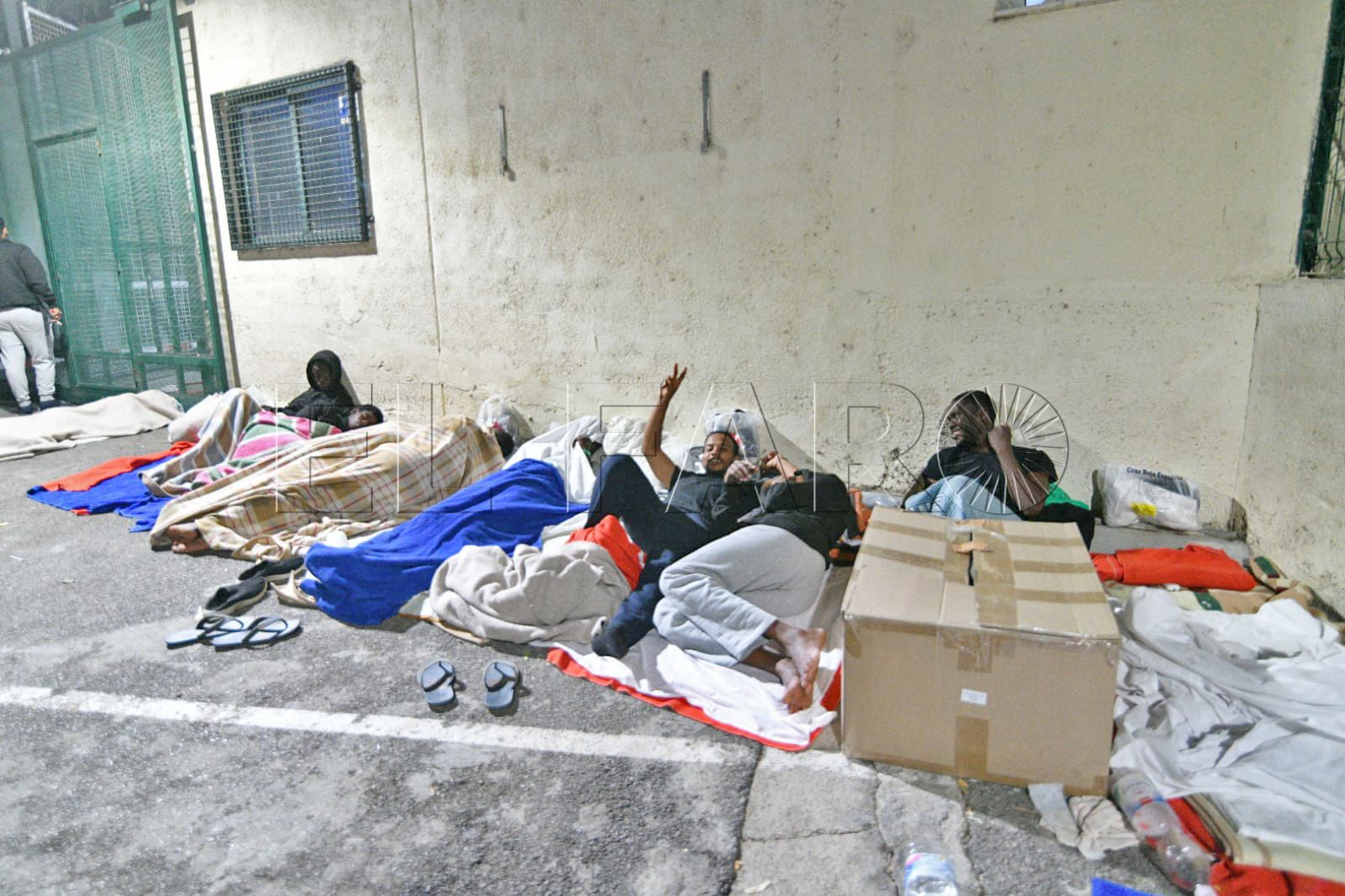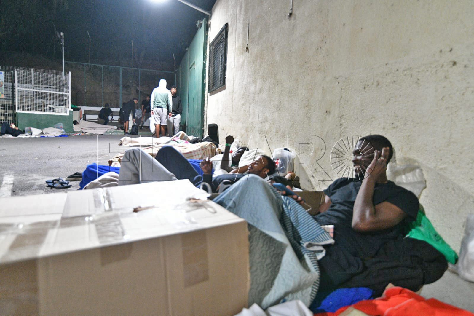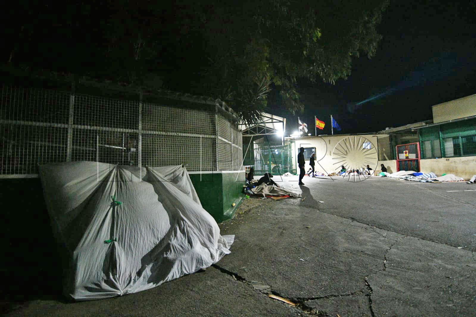 FAROTV acudió esta pasada madrugada a constatar su presencia. Con las puertas del centro de acogida cerradas, sin el letrero que antiguamente reseñaba que aquello era un CETI, unas 40 personas duermen rodeando todos los accesos o en la parte de monte más próxima.