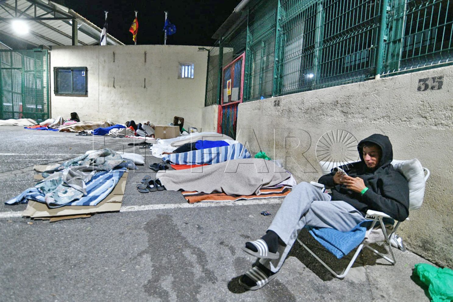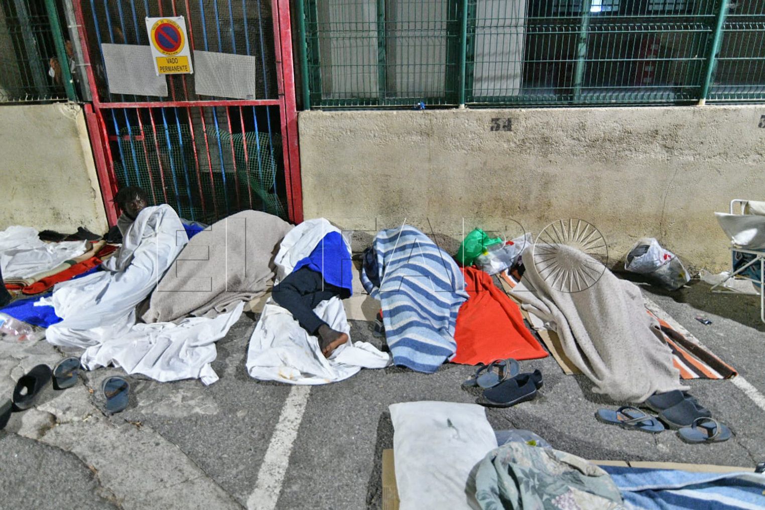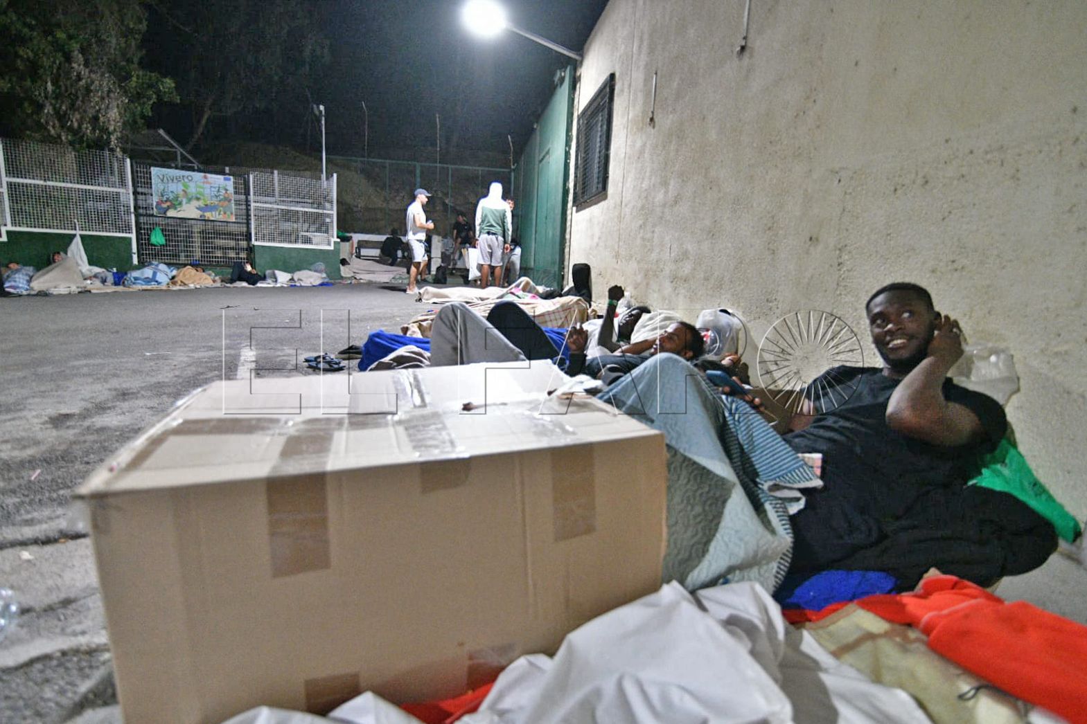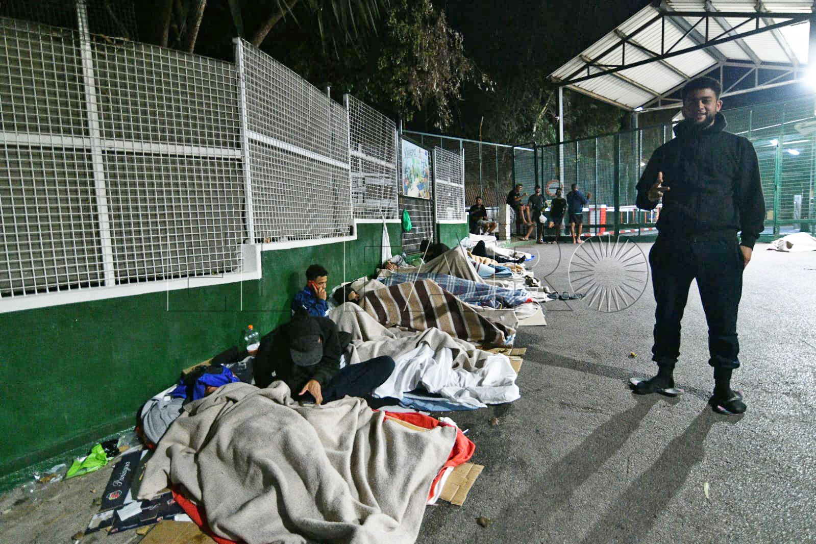 FAROTV acudió esta pasada madrugada a constatar su presencia. Con las puertas del centro de acogida cerradas, sin el letrero que antiguamente reseñaba que aquello era un CETI, unas 40 personas duermen rodeando todos los accesos o en la parte de monte más próxima.