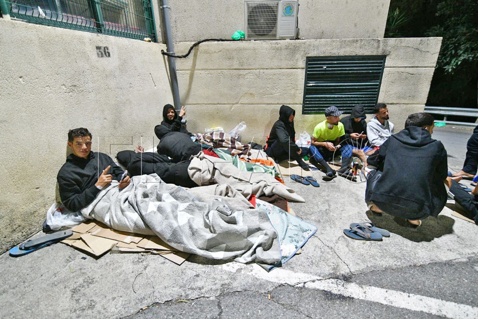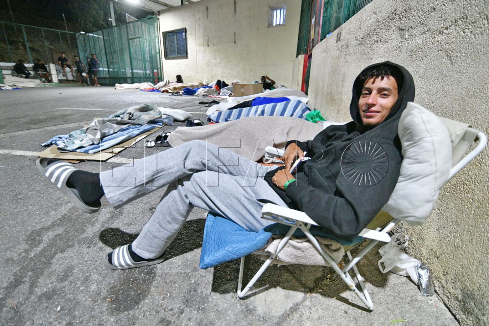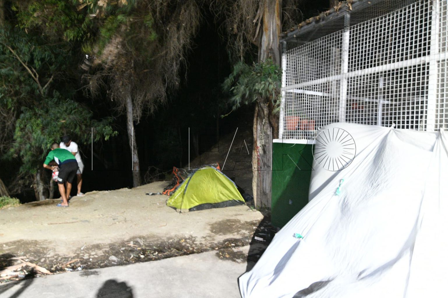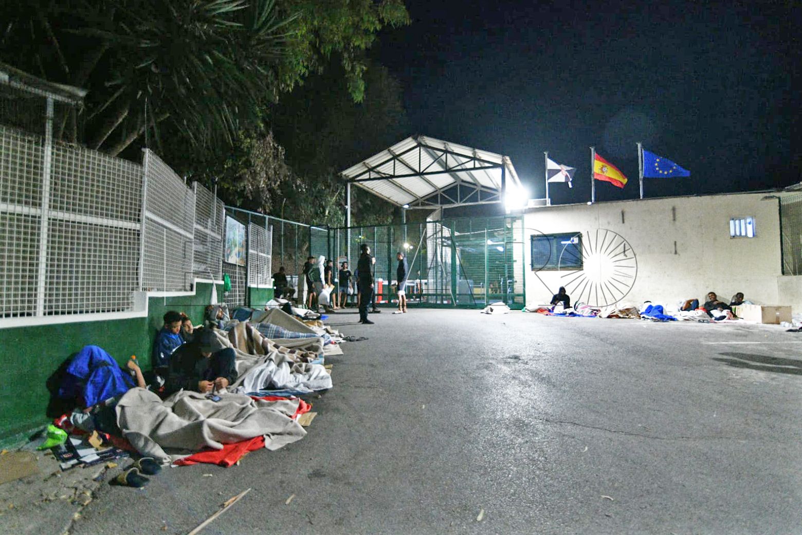 FAROTV acudió esta pasada madrugada a constatar su presencia. Con las puertas del centro de acogida cerradas, sin el letrero que antiguamente reseñaba que aquello era un CETI, unas 40 personas duermen rodeando todos los accesos o en la parte de monte más próxima.