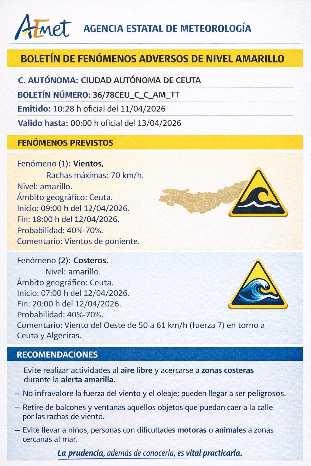 La Agencia Estatal de Meteorología (Aemet) ha emitido una alerta por fenómenos meteorológicos adversos de nivel amarillo que afectarán a Ceuta durante la jornada de este domingo, 12 de abril, en concreto por vientos fuertes y fenómenos costeros.