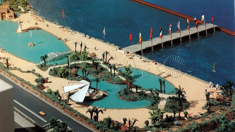 En pleno centro de la ciudad se ubica un auténtico oasis, una fusión de los tres elementos que mejor dominaba su autor: tierra, mar y aire. Un total de 56.000 metros cuadrados de los cuales 38.000 es zona de solarium, jardines y equipamientos de ocio.