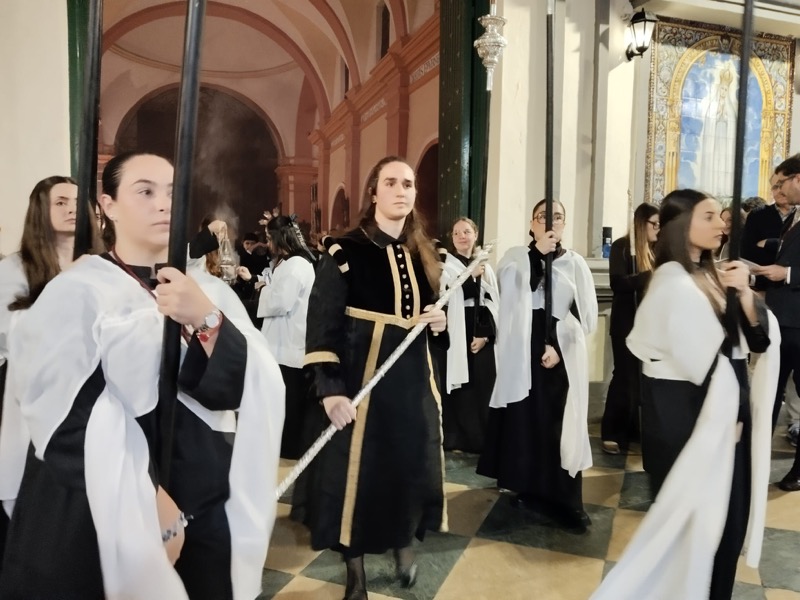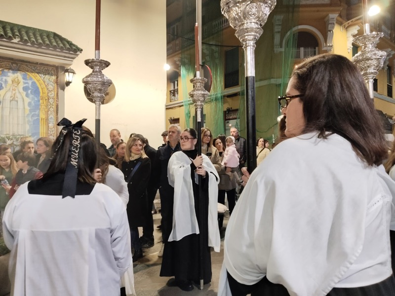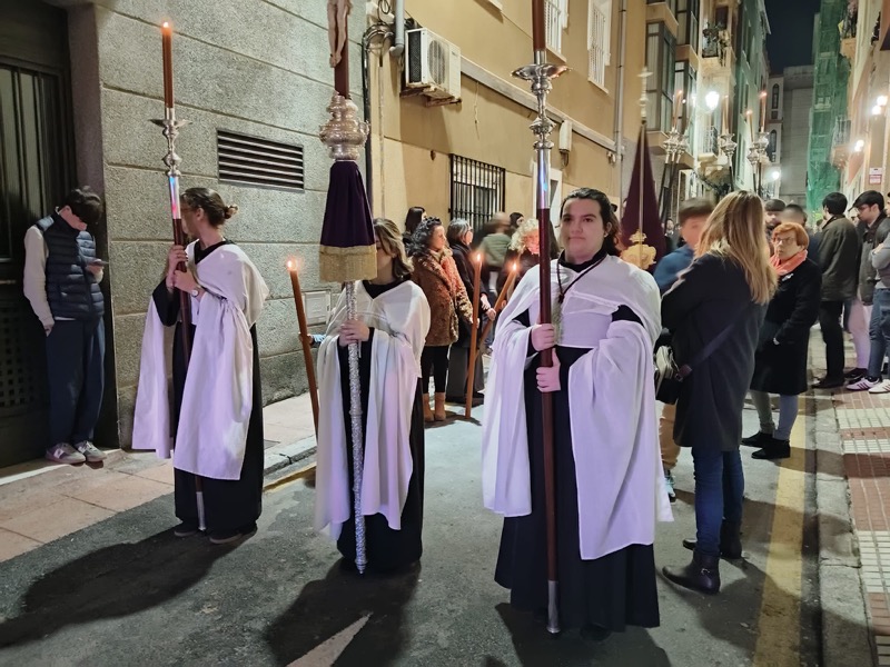 A unos metros les ha aguardado la cofradía de La Flagelación, que, en su oratorio, se han unido al rezo en la segunda estación de penitencia. Allí, una de los miembros de la Junta de Gobierno, se ha encargado de leer en voz alta el siguiente pasaje de la Biblia.