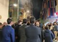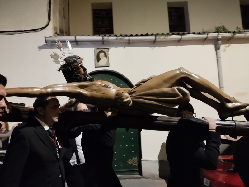El cristo de la Buena Muerte ha estado, por un tiempo, frente a frente con la imagen titular de la otra corporación antes de proseguir e ir al siguiente punto. El séquito que ha realizado en total catorce paradas en lugares próximos al templo.