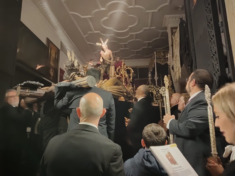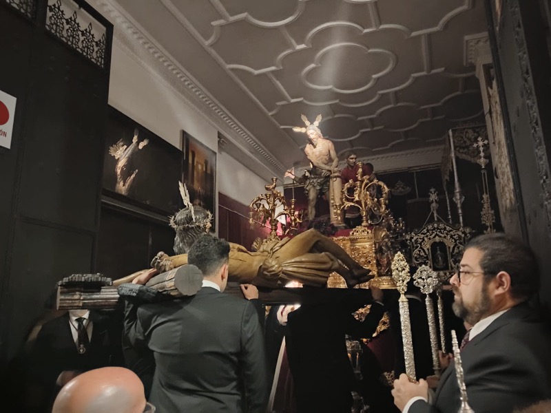 La talla sacra ha sorprendido a los viandantes a su paso que, con respeto, han observado cómo han avanzado con él. El sonido dulce de los dos instrumentos de viento metal ha puesto sobre aviso a los transeúntes que han estado por la zona de casualidad. A paso ligero, el cortejo ha descendido por la calle tras doblar la esquina.