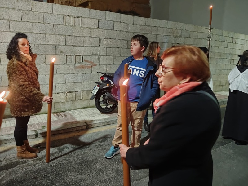Minutos antes de su salida, dentro de la parroquia, han finalizado los rezos antes de salir al exterior. Guiados por una voz, se han preparado para salir en cortejo. Acompañados de varillas y cirios, por orden, han salido. Monaguillos y hermanos de la corporación han honrado al Cristo de la Buena Muerte. Dos de los integrantes han interpretado melodías melancólicas con sus flautas traveseras.