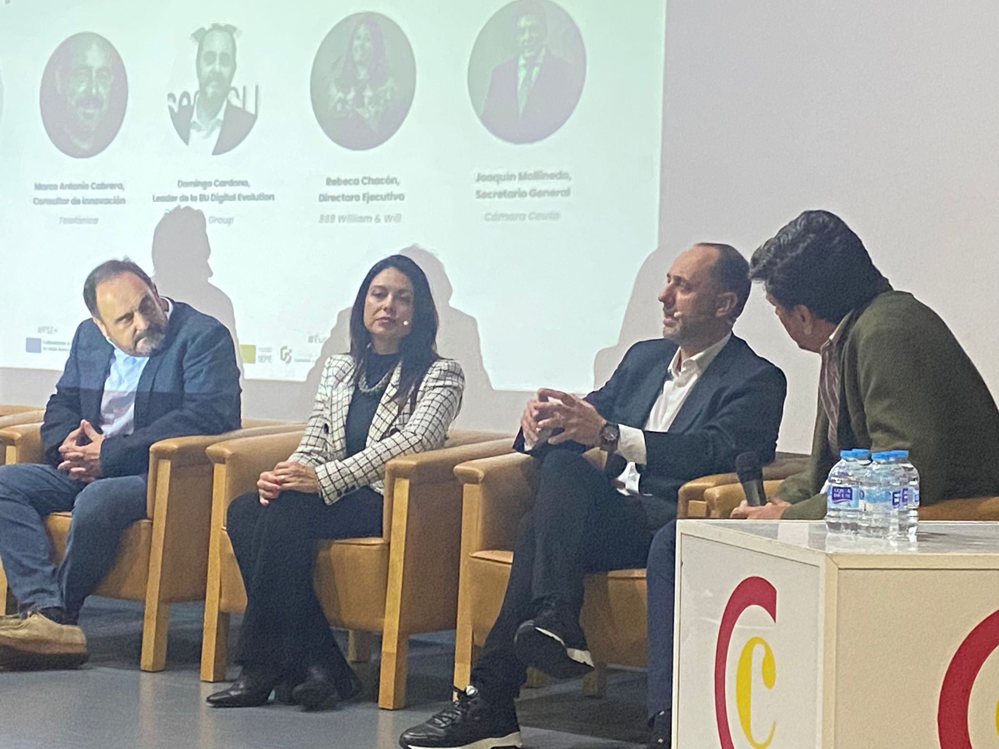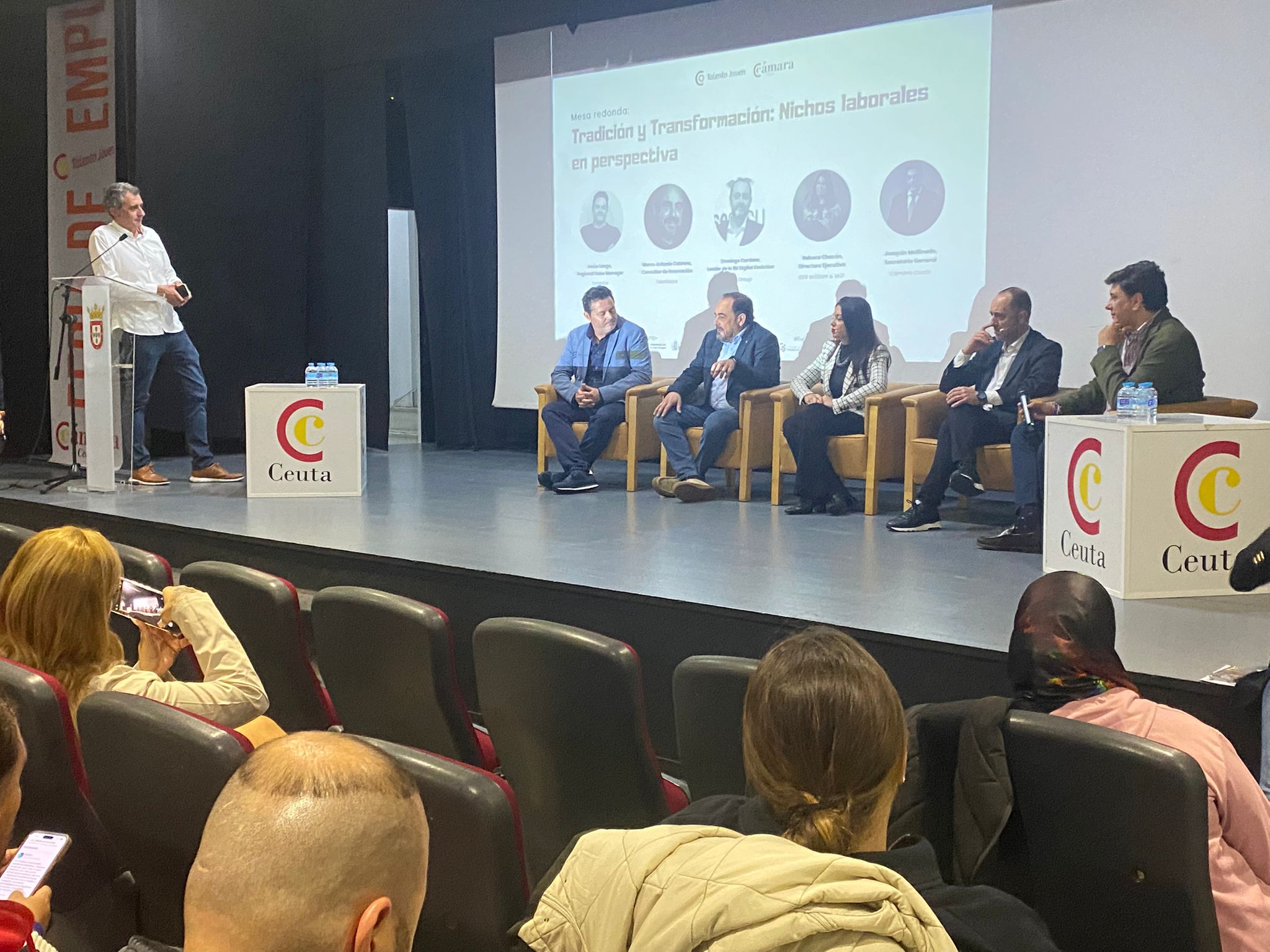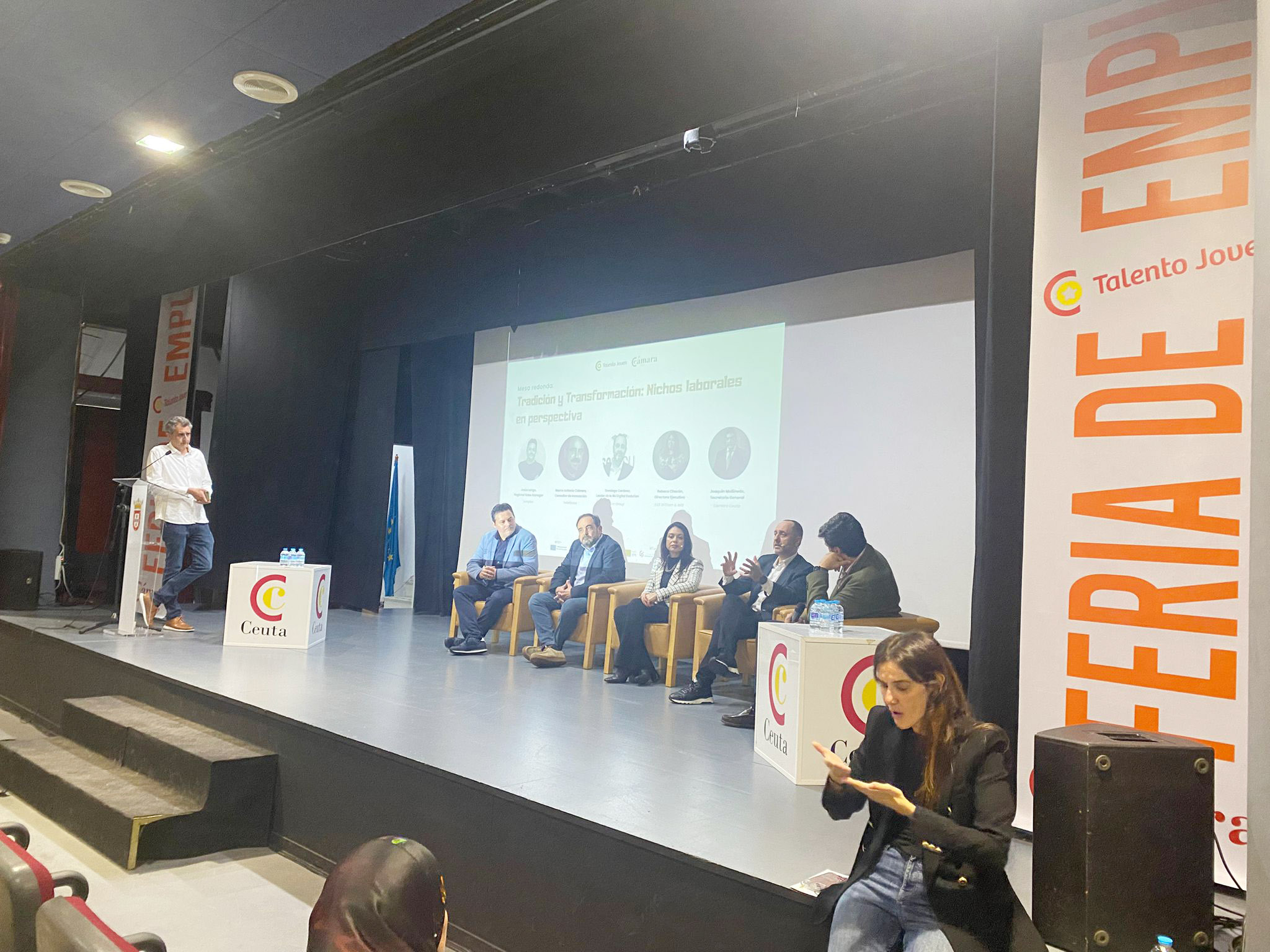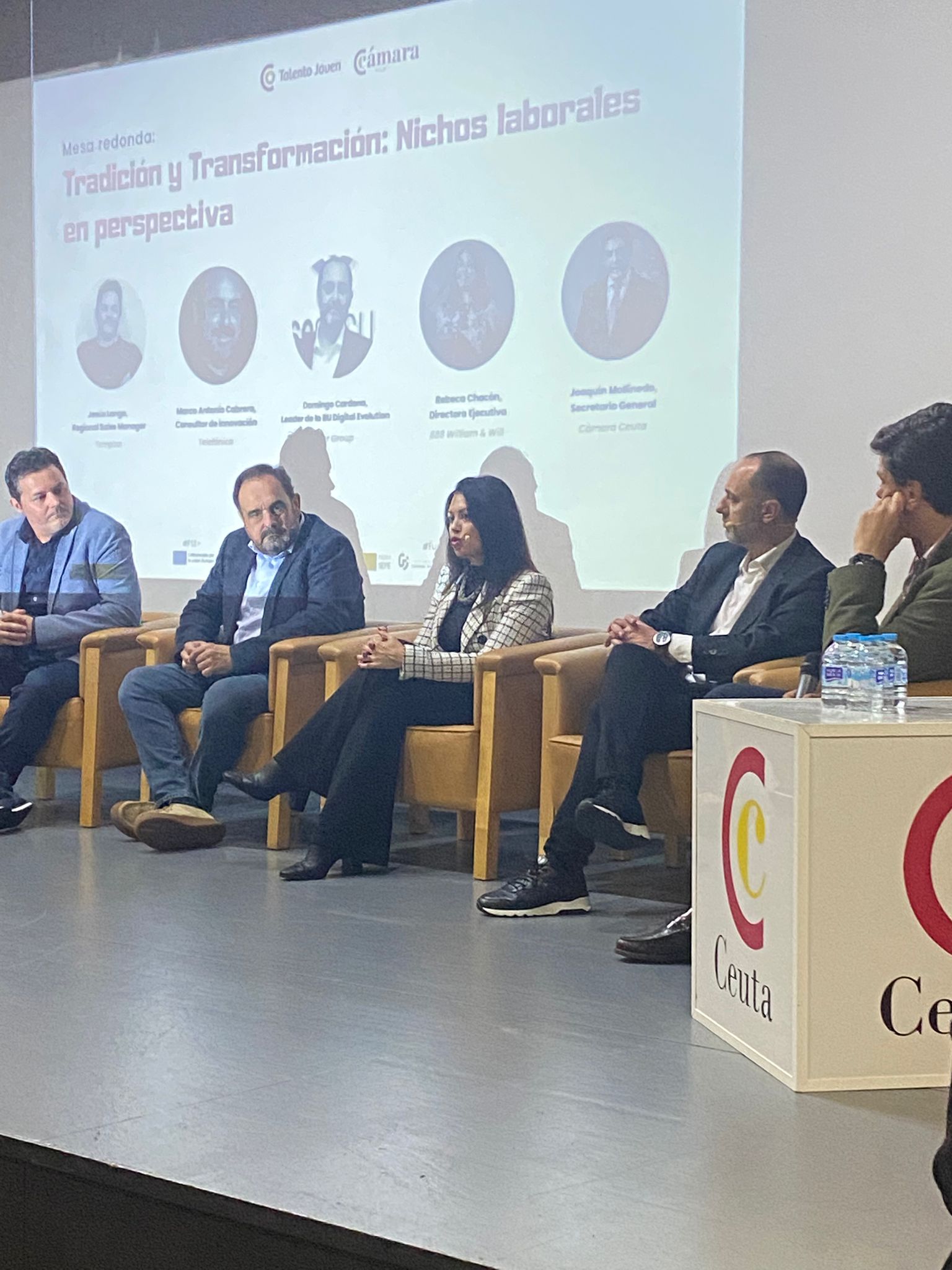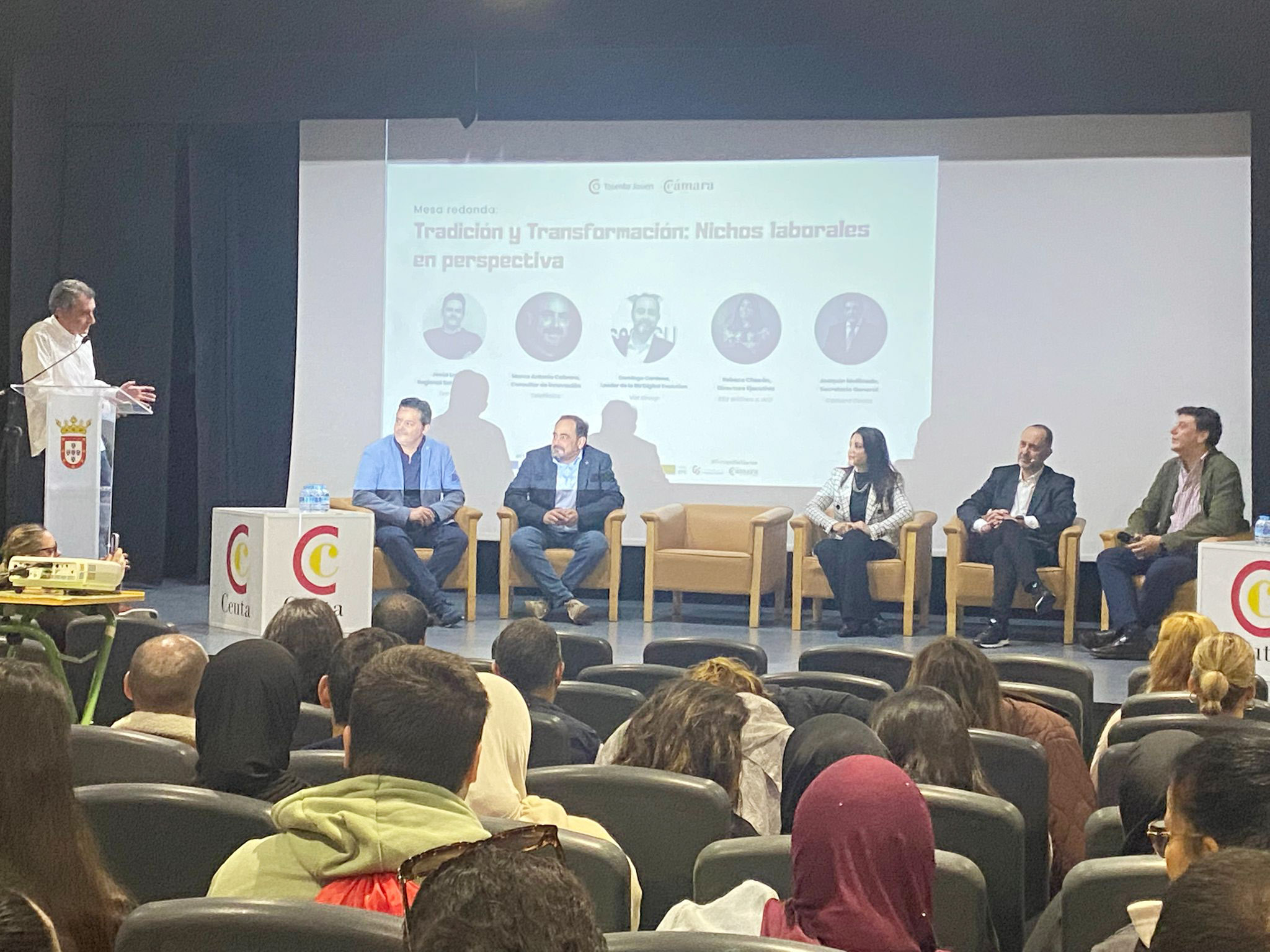 Uno de los momentos más enriquecedores de la jornada fue la mesa redonda “Tradición y Transformación: nichos laborales en perspectiva”, que reunió a representantes de empresas tecnológicas y del sector del juego online, como Rebeca Chacón (888 William Hill), Domingo Cardona (leader de la BU Digital Evolution), Jesús Langa (regional sales manager en Templus), Marco Antonio Cabrera (director estratégico de Telefónica) y Joaquín Mollinedo (secretario general de la Cámara de Comercio de Ceuta).