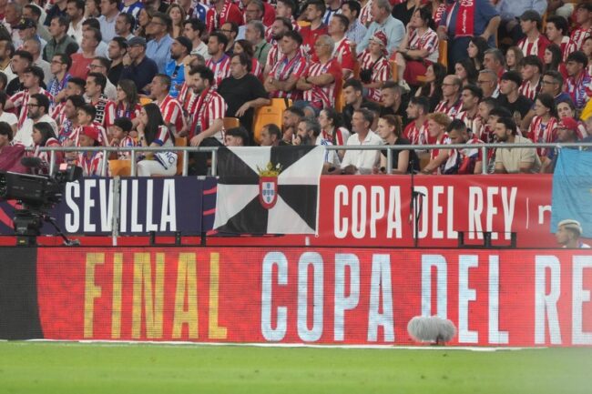 Entre el ambiente del estadio, la presencia de Ceuta no ha pasado desapercibida. La bandera de la Ciudad Autónoma ha logrado hacerse un hueco en las gradas de La Cartuja, situada en una posición privilegiada, a escasos metros del terreno de juego.