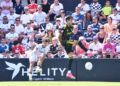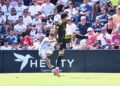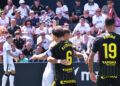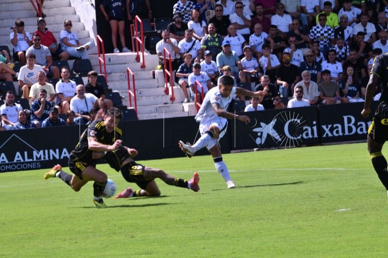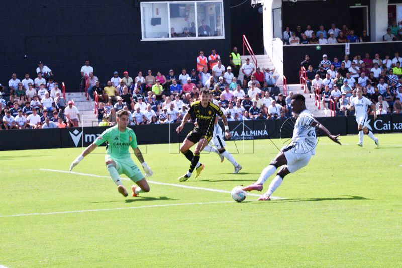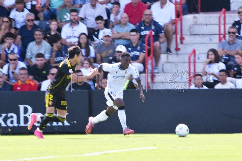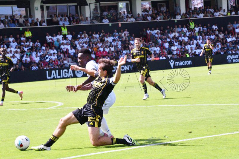Una de las últimas de la primera parte fue para el Zaragoza. Tasende se prolongó en la banda izquierda y puso un centro que no llegó a controlar ni Dani Gómez ni Kenan Kodro, pero el bosnio le dejó el balón a Keidi Bare que chutó a puerta pero se fue desviado a metros de la portería de Guille Vallejo.
