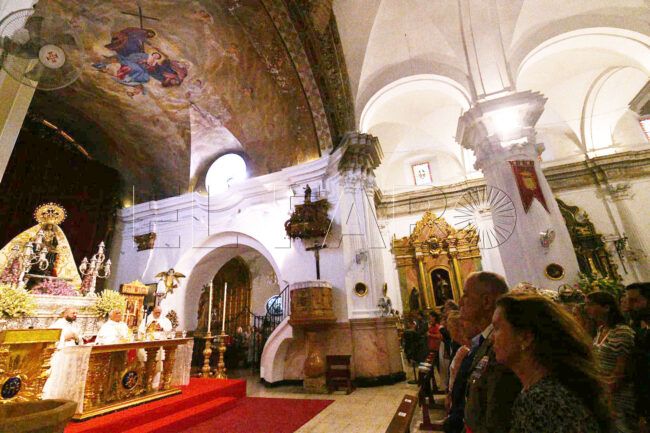Cestos con flores a modo de ofrenda a la Patrona se han erigido en las columnas del templo. Una misa coloreada y en silencio en la que la música ha cobrado un gran protagonismo.
