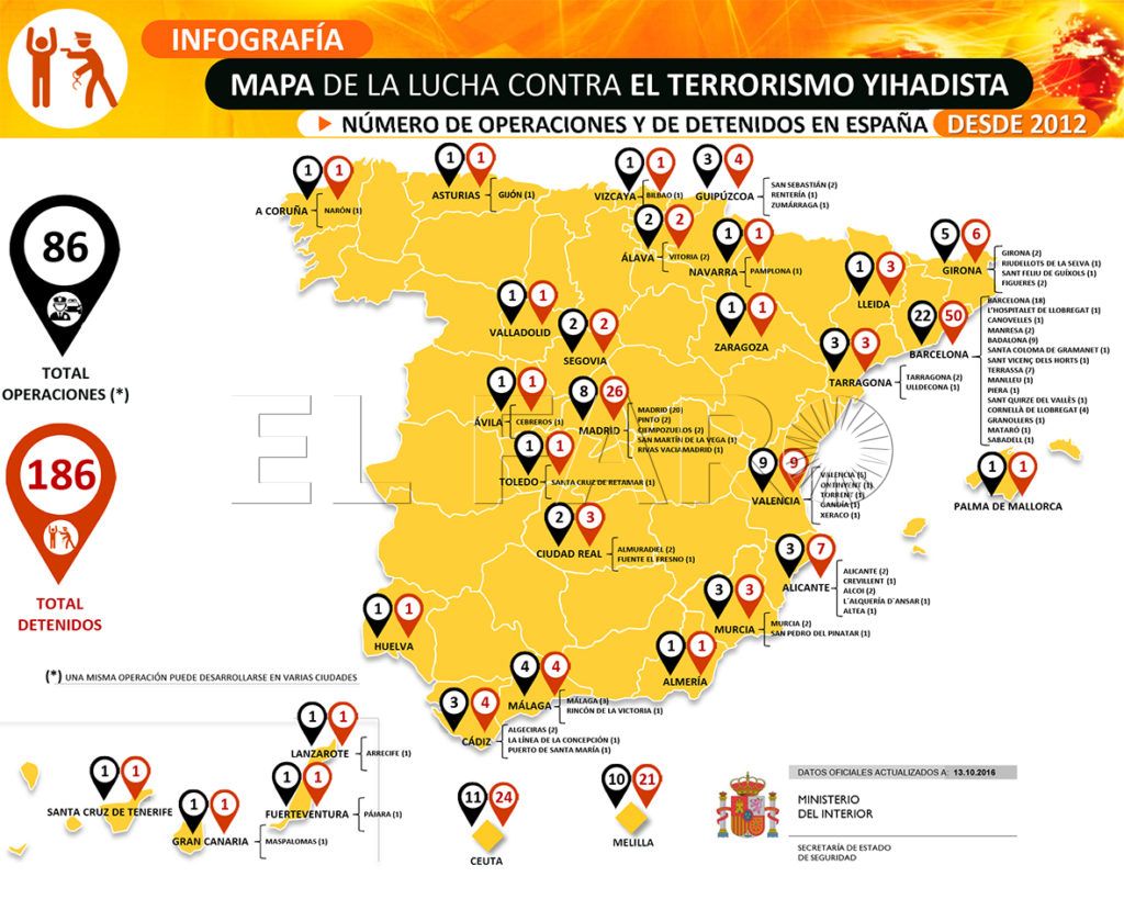 La página web del Ministerio del Interior ha publicado dos infografías que reflejan todas las operaciones y detenciones del terrorismo yihadista en España, de forma que se puede ver de forma gráfica dónde se han concentrado los arrestos practicados por las fuerzas de seguridad. Detallado por provincias y localidades, los dos mapas incluyen la distribución de estas operaciones y detenciones de 2016 así como del total de esta lucha contra el yihadismo desarrollada desde 2012.