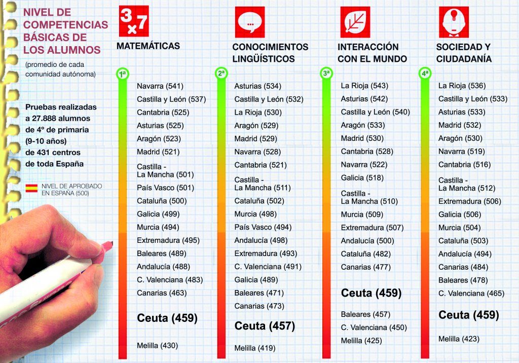 La secretaria de Estado de Educación y Formación Profesional del Ministerio de Educación, Eva Almunia, ha presentado los datos de la Evaluación General de Diagnóstico realizada en 2009 a alumnos de cuarto de Primaria, la primera que se realiza en el conjunto de España según establece la Ley Orgánica de Educación. Ceuta y Melilla se encuentran por debajo del promedio del territorio nacional, que equivale a 500 puntos.