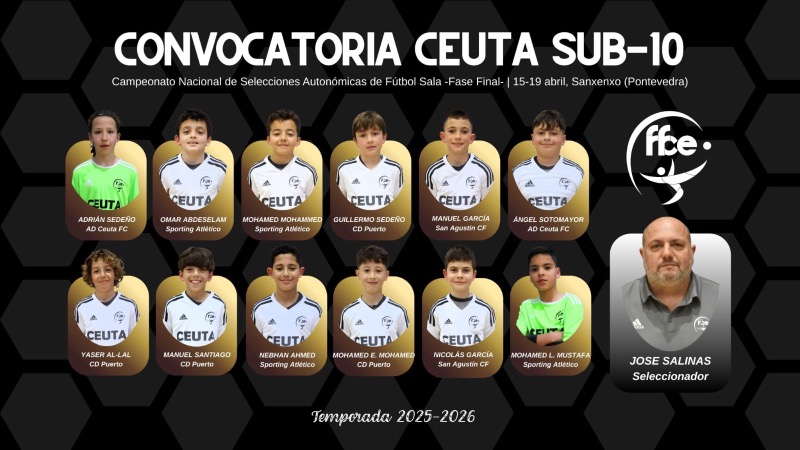 La convocatoria de la selección Sub-10 masculina está integrada por: Adrián Sedeño, Omar Abdeselam, Mohamed Mohammed, Guillermo Sedeño, Manuel García, Ángel Sotomayor, Yaser Al-Lal, Manuel Santiago, Nebhan Ahmed, Mohamed E. Mohamed, Nicolás García y Mohamed L. Mustafá.El seleccionador es José Salinas.