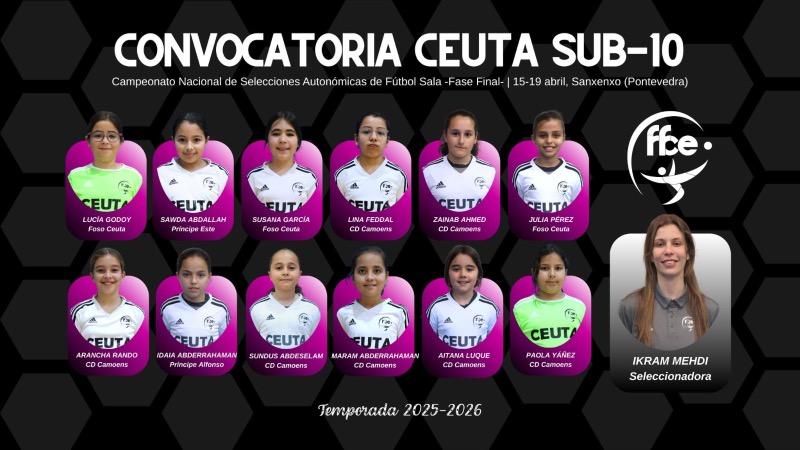 La convocatoria de la selección Sub-10 femenina está formada por: Lucía Godoy, Sawda Abdallah, Susana García, Lina Feddal, Zainab Ahmed, Julia Pérez, Arancha Raindo, Idaia Abderrahman, Sundus Abdeselam, Maram Abderrahman, Aitana Luque y Paola Yáñez. La seleccionadora es Ikram Mehdi.