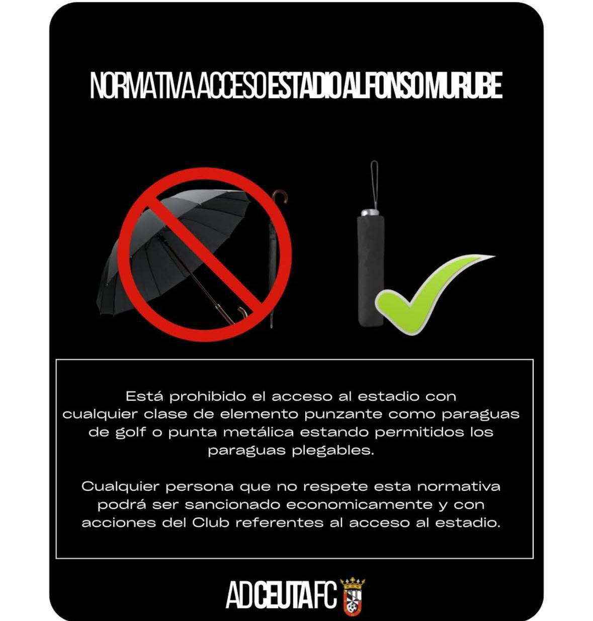 El Ceuta encontró solución e hizo caso a las peticiones de los aficionados: “Está prohibido el acceso al estadio con cualquier clase de elemento punzante como paraguas de golf o punta metálica estando permitidos los paraguas plegables”, publica el club en sus redes.