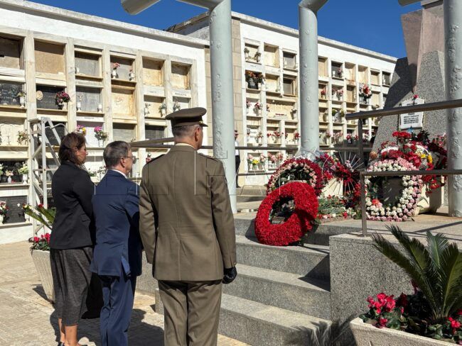 El recorrido por el cementerio de Santa Catalina ha continuado en dirección al monolito de los caídos en la Guerra de África, en donde el presidente, la consejera de Sanidad y Servicios Sociales y el comandante general de Ceuta han depositado una corona de laurel.