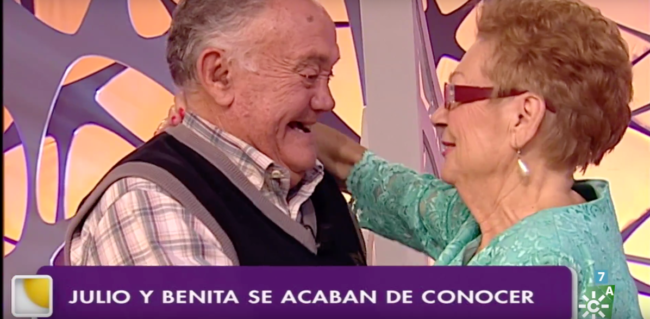 Julio, de 80 años acudió al programa de Canal Sur ‘La tarde aquí y ahora’ para encontrar una pareja con la que recuperar la ilusión y acabar con la soledad. Dos semanas después de su presentación en el programa de Juan y Medio, este viudo ha vuelto este jueves al programa para conocer en persona a su pretendienta: Benita, de 76 años y, aunque es nacida en Melilla, lleva 40 años residiendo en Ceuta.