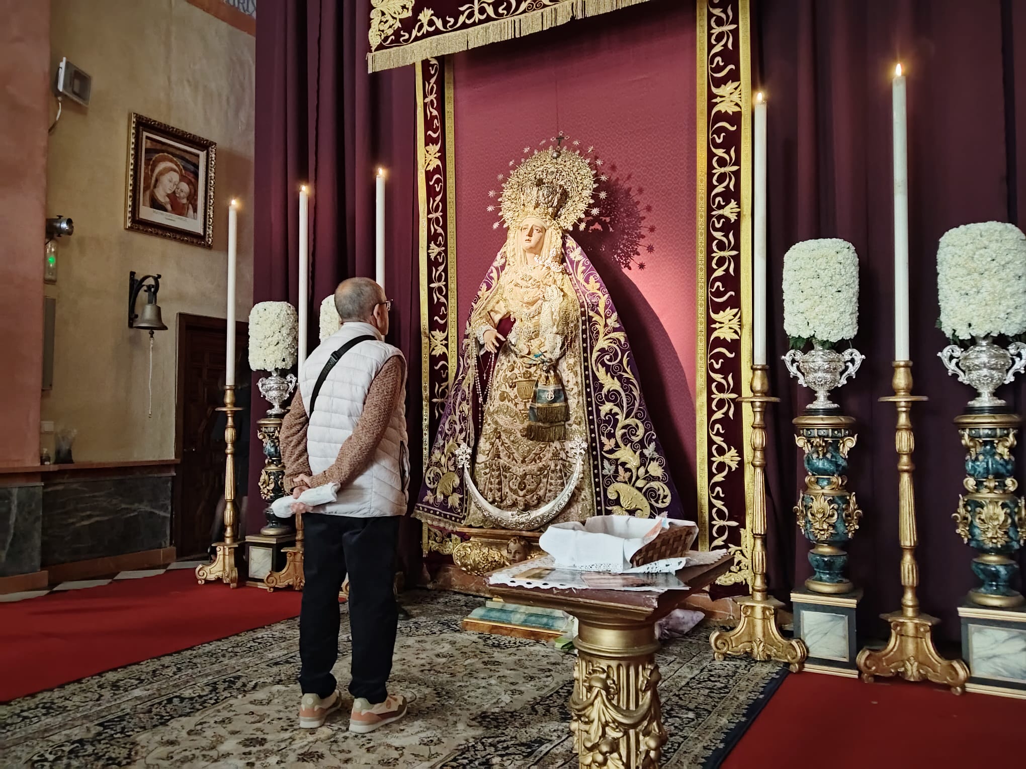Gota a gota, los ceutíes se han acercado a ella tras recorrer el pasillo que separa la hilera de bancos de la parroquia. Engalanada para la ocasión y sobre una alfombra roja, uno a uno se ha aproximado para dar un beso en su mano, mirarla y santiguarse.