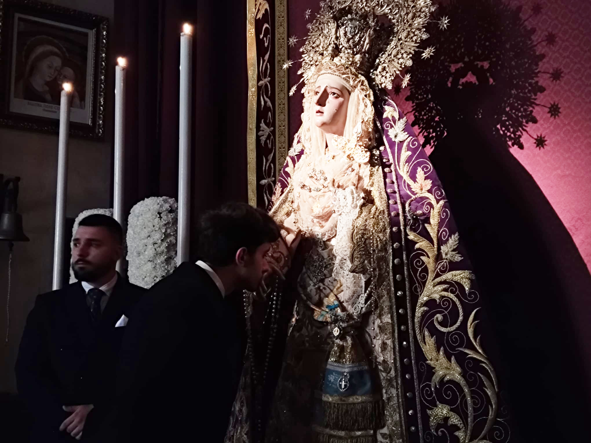 Jóvenes y mayores han repetido este gesto en el silencio sepulcral de la iglesia. Al llegar al fondo del santuario, los han recibido los hermanos de la cofradía, que han velado por la Virgen del Mayor Dolor.