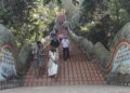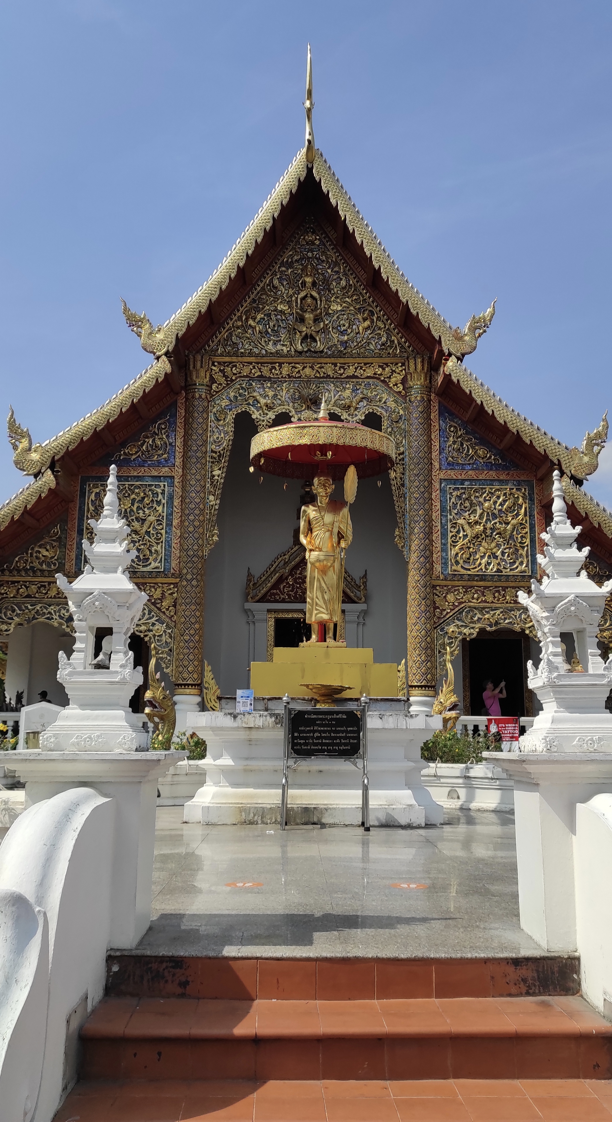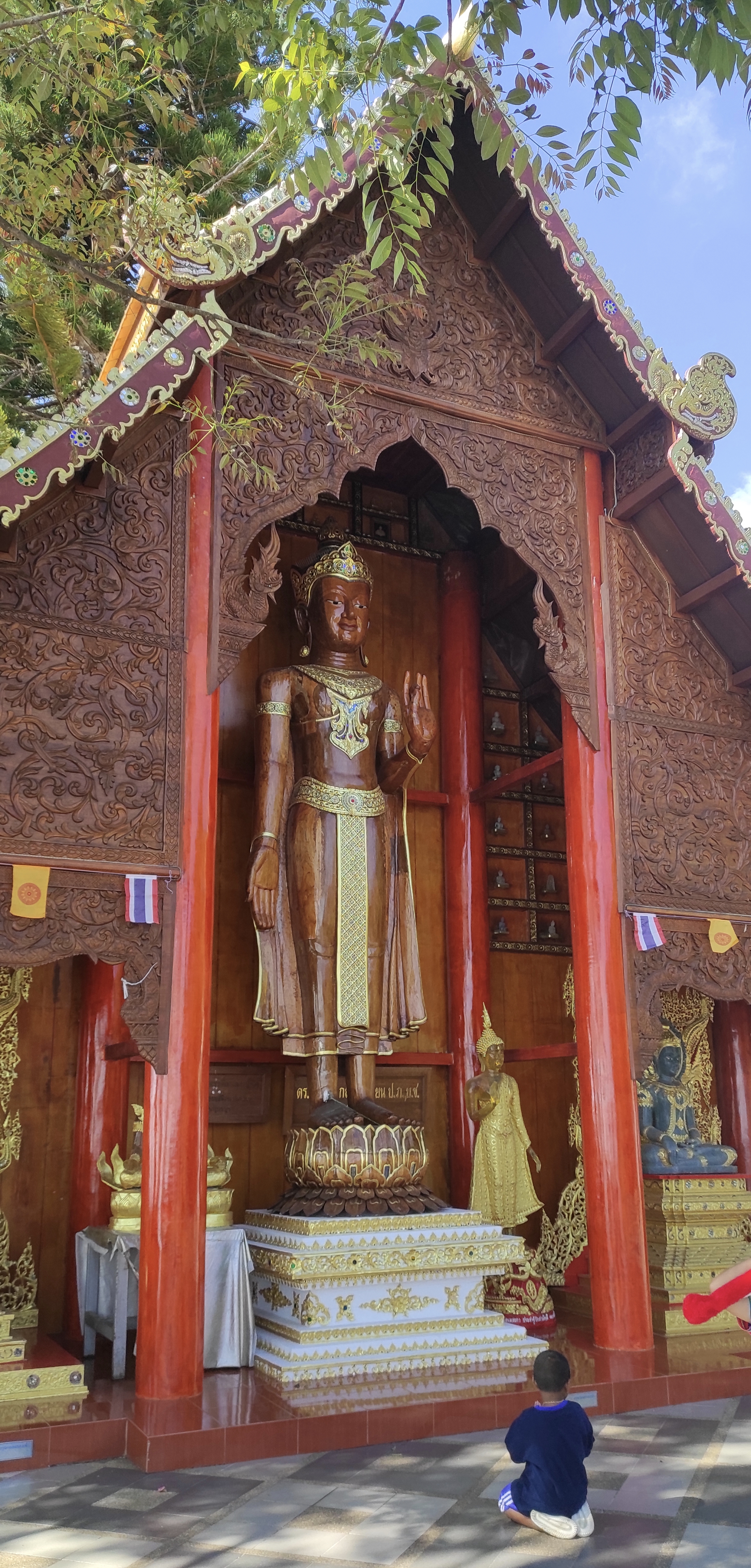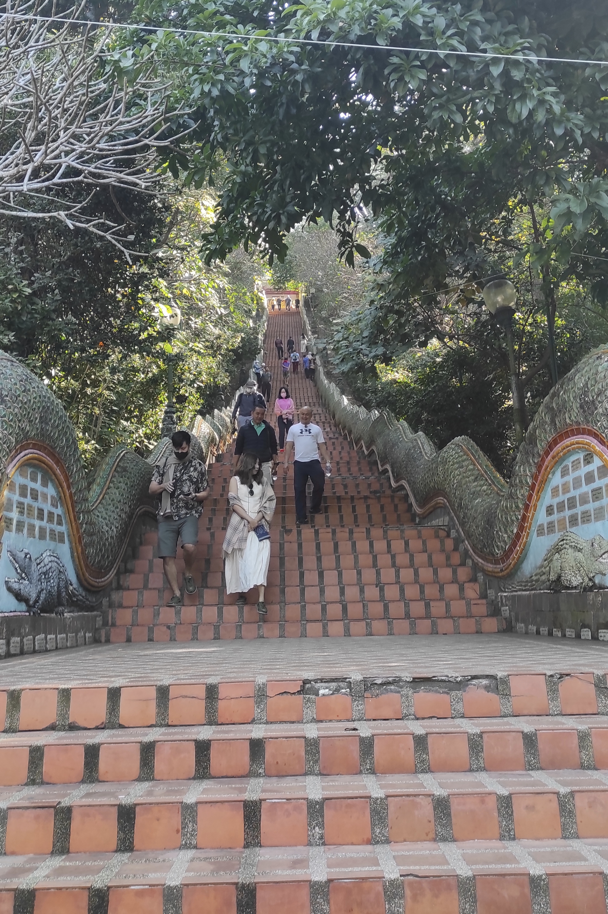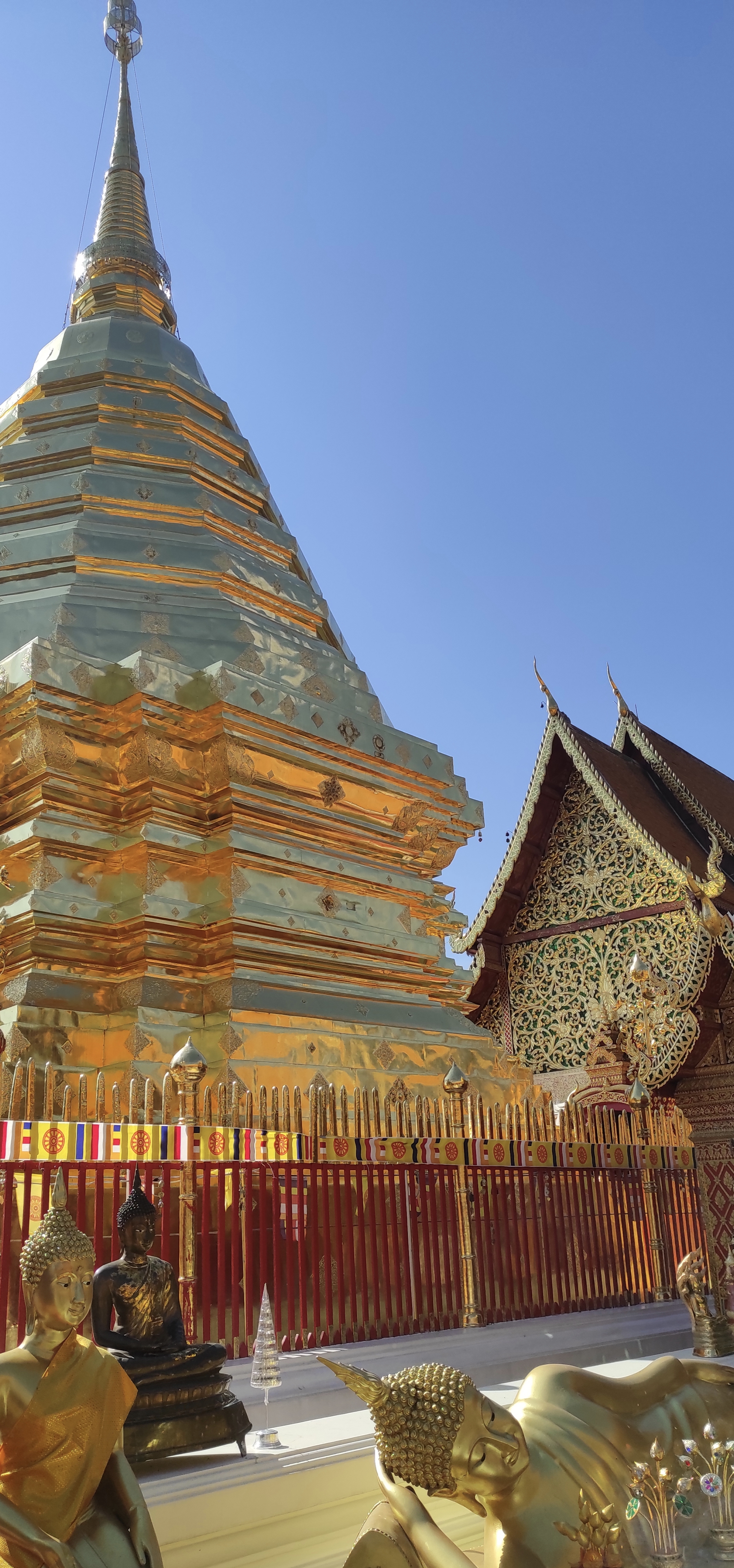 A pesar de la inesperada fiesta, logro madrugar para visitar el templo Doi Suthep. Está a cuarenta y cinco minutos en coche a las afueras de Chiang Mai. En el trayecto hago amistad con un chico de Tokio, Tomoki Ikeda, aventurero y buen conversador con el que coincidiría meses después en Japón. Nos dirigimos a ver el Buda que vigila la entrada. Después de subir 360 escalones y descalzarnos (en ese orden), el templo aparece escoltado por preciosos grabados y bellos edificios de arquitectura siamesa. Sobre una inmensa tela dorada pongo los nombres de mis seres queridos para que sean bendecidos, es costumbre del templo, me recuerda un poco a cuando echas la bonoloto en el estanco de turno pero por si acaso…