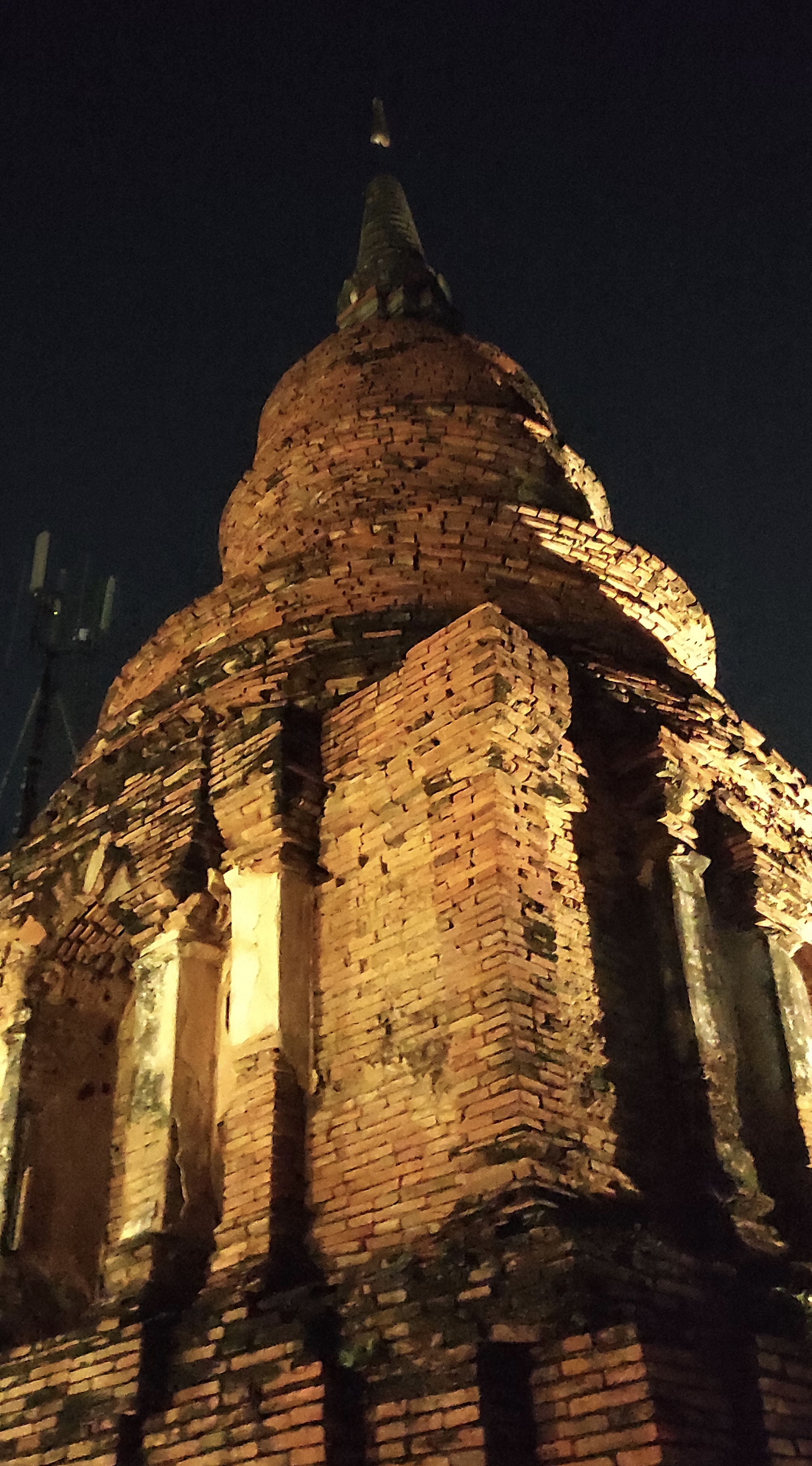 Paseo sin rumbo fijo y termino dando con la plaza cercana a los tres reyes fundadores y sobre el escenario, que el día antes estaban montando, se encontraba un grupo de rock bastante decente cantando en tailandés un tema pegadizo que la gente bailaba animadamente debajo del escenario, me uní a ellos y antes de que terminara esa canción alguien me dio una cerveza y todos bailábamos como si fuera Hamelin el que estuviese tocando en el escenario. Después del concierto nos despedimos como pudimos. El inglés y la cerveza no hacen buenas migas. Tardé en llegar al hostel, no lo encontraba, pero no hay mal que por bien no venga, por casualidad encontré pagodas antiguas de tosca construcción, de algo parecido a la argamasa, que me parecieron realmente hermosas. Anduve en círculos por las calles un par de veces antes de lograr encontrar el hostel.