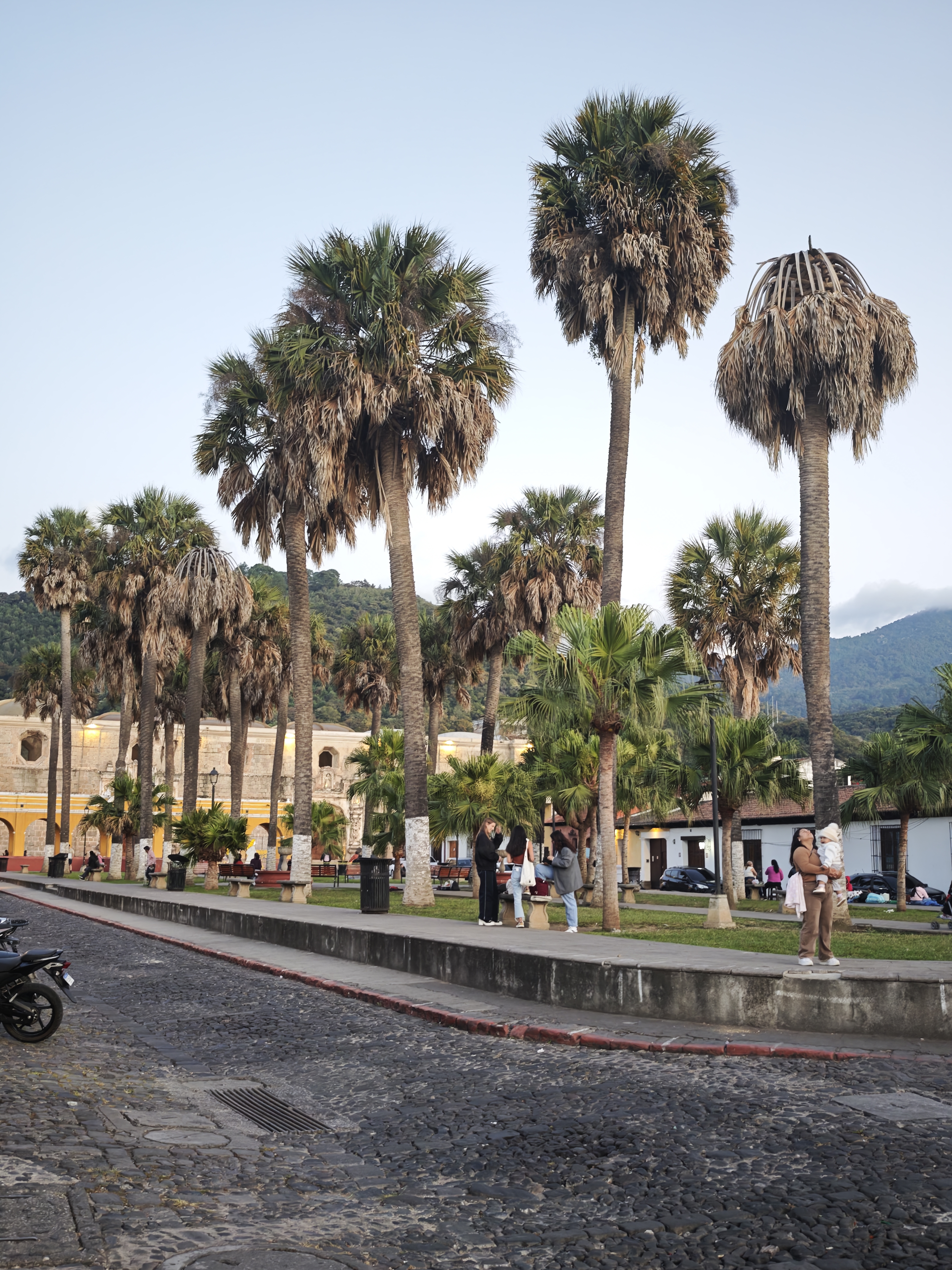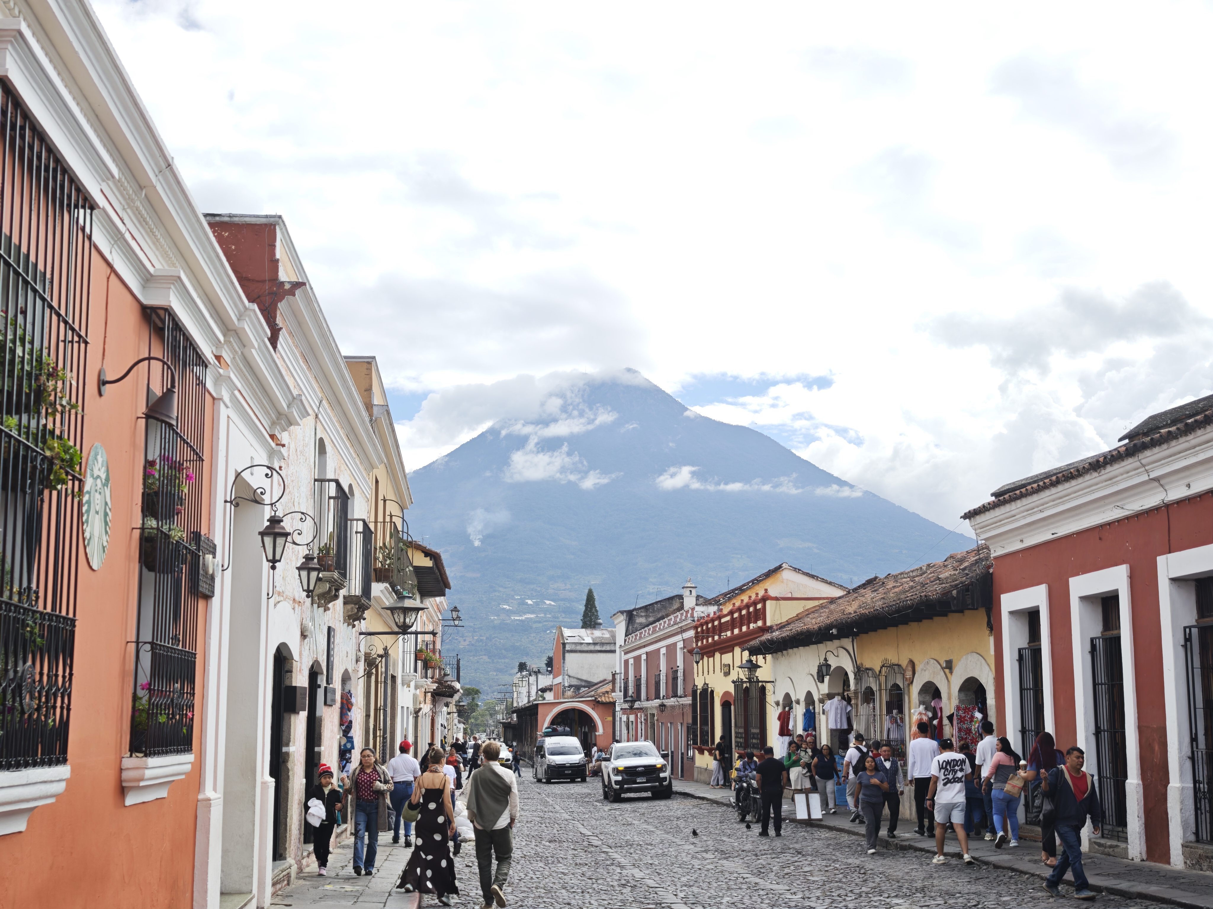 Antigua fue construido por cuadras, como en Barcelona, es imposible perderte. Las calles empedradas en forma cóncava para facilitar el desagüe los días de lluvia, aceras de medio metro de alto y casas bajas, los edificios principales como el ayuntamiento o el museo llegaban a dos plantas. Para hacerme una idea del pueblo subí al Cerro de la Cruz y desde lo alto pude hacerme una idea de Antigua acunada por su protector, o destructor según se mire, el volcán de Agua. Todo o casi todo en mi viaje lleva un ritmo pausado, no tengo en cuenta al tiempo, lo saco de la ecuación y así, como un cero, disfrutaba debajo de una inmensa cruz del incomparable paisaje con un escandaloso silencio, en ese momento amé ser yo.